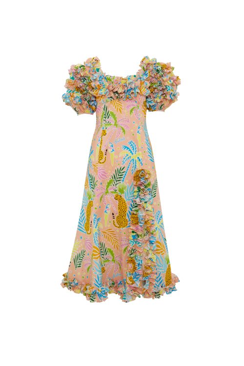 A casual Aloha-inspired dress crafted from cotton voile, featuring the Star Jungle print in Peach Sky. Designed with ruffle details along the sleeves and neckline for added dimension, while the front slit with ruffles brings a subtle, playful edge. Perfect for beachside events or lighthearted gatherings during vacation trips. Pair with heels to complete a confident and polished look.
