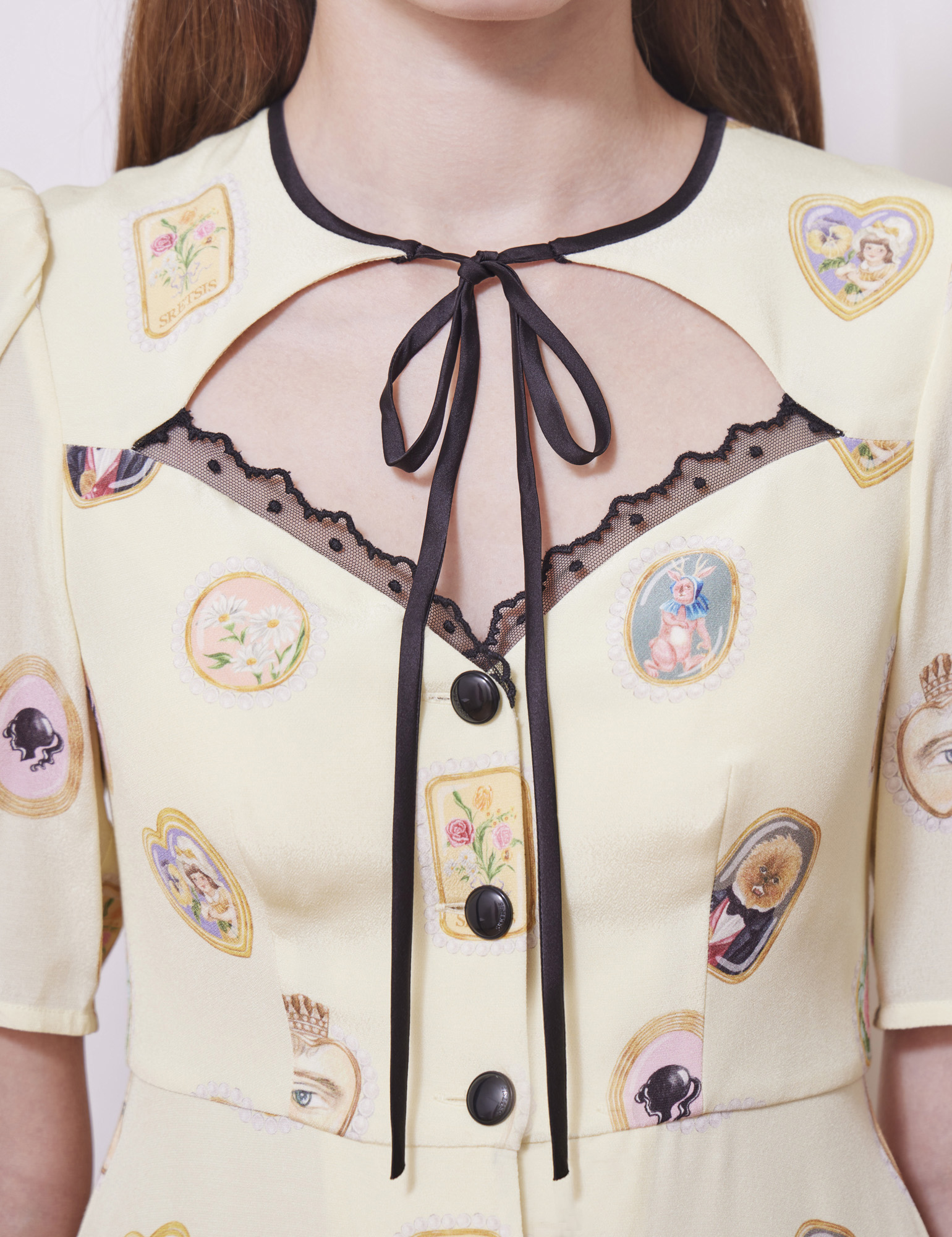 LOCKET WALL PRINTED RAYON MINI DRESS WITH SWEETHEART CUTOUT AND SATIN BOW DETAIL