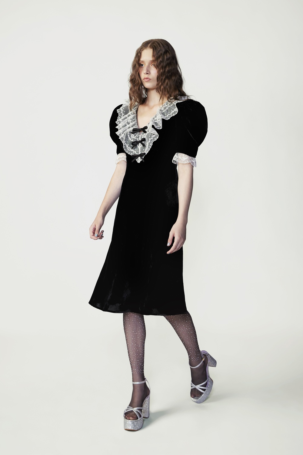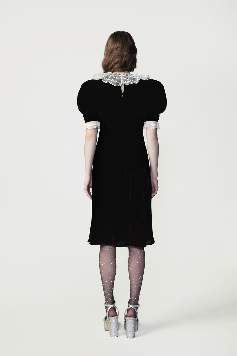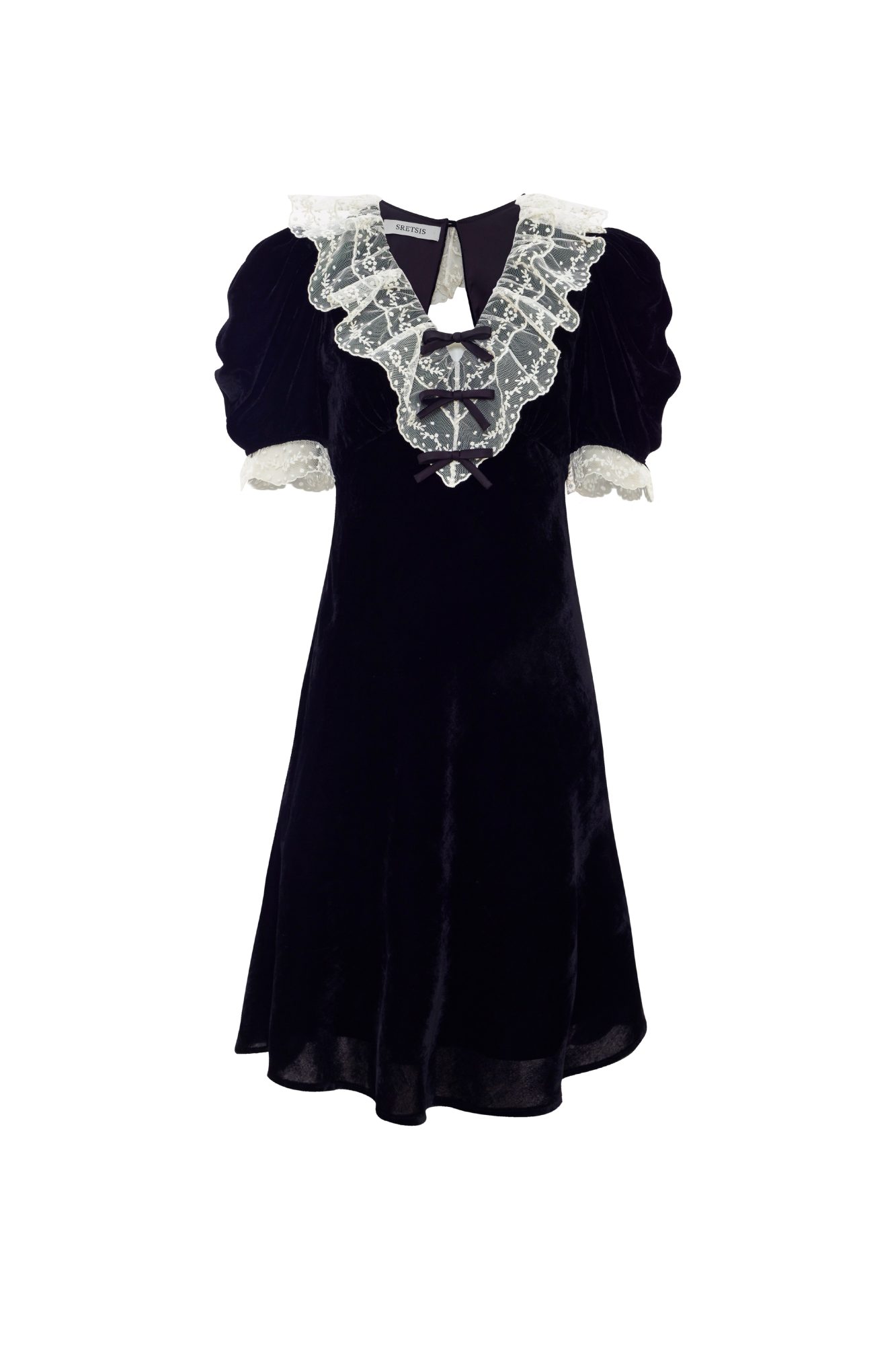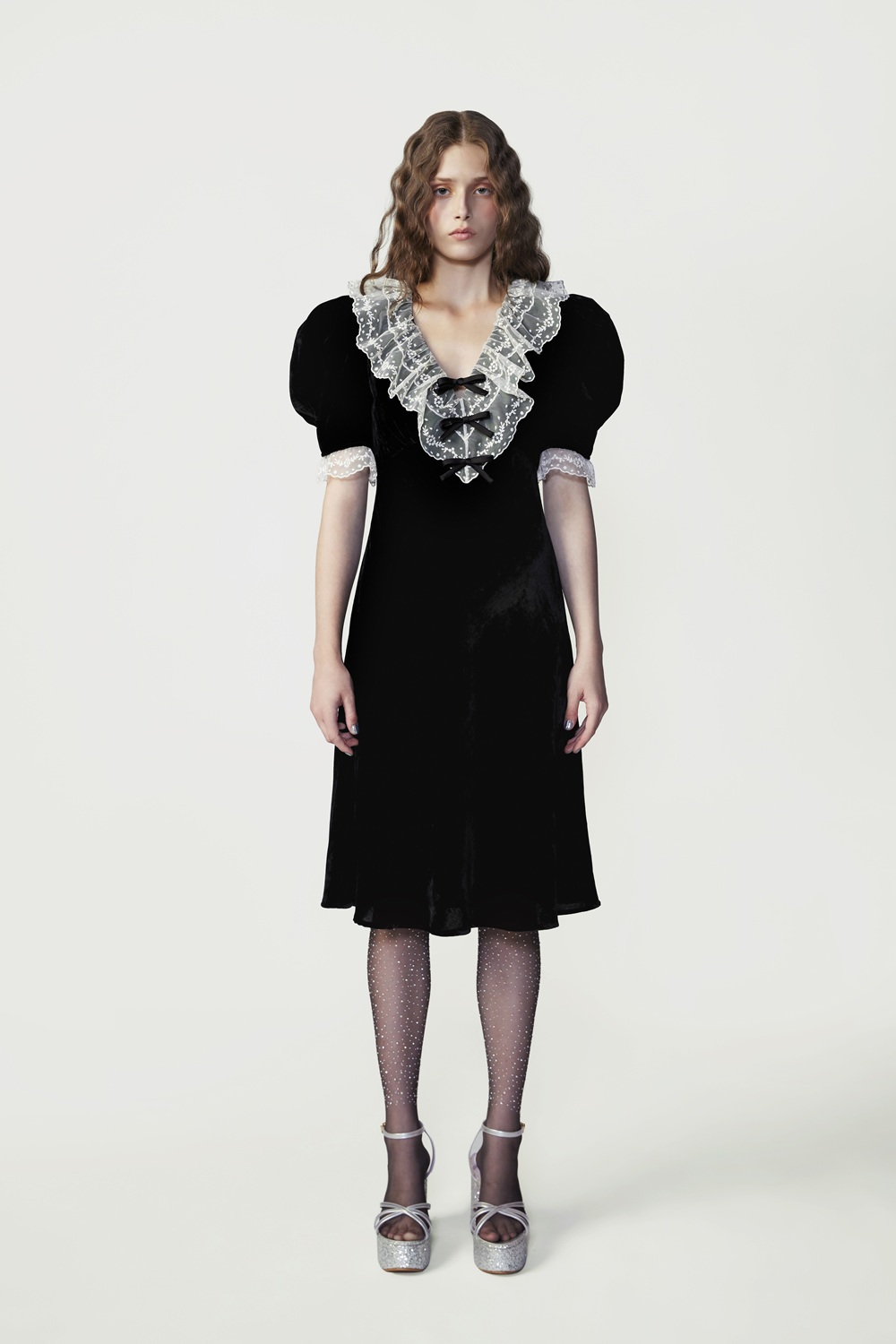 This black viscose-nylon dress embodies elegance with its lace ruffled collar, adorned with a satin bow for a refined finish. The silhouette cinches at the waist before flowing softly over the hips, making it an ideal choice for special evening occasions.