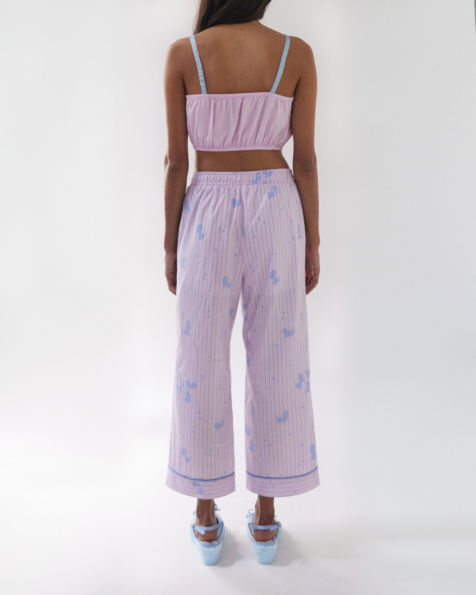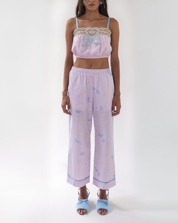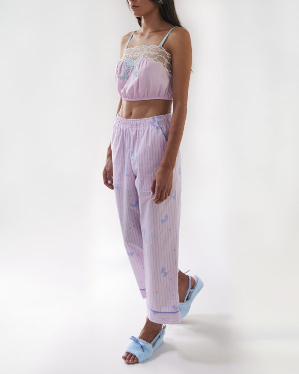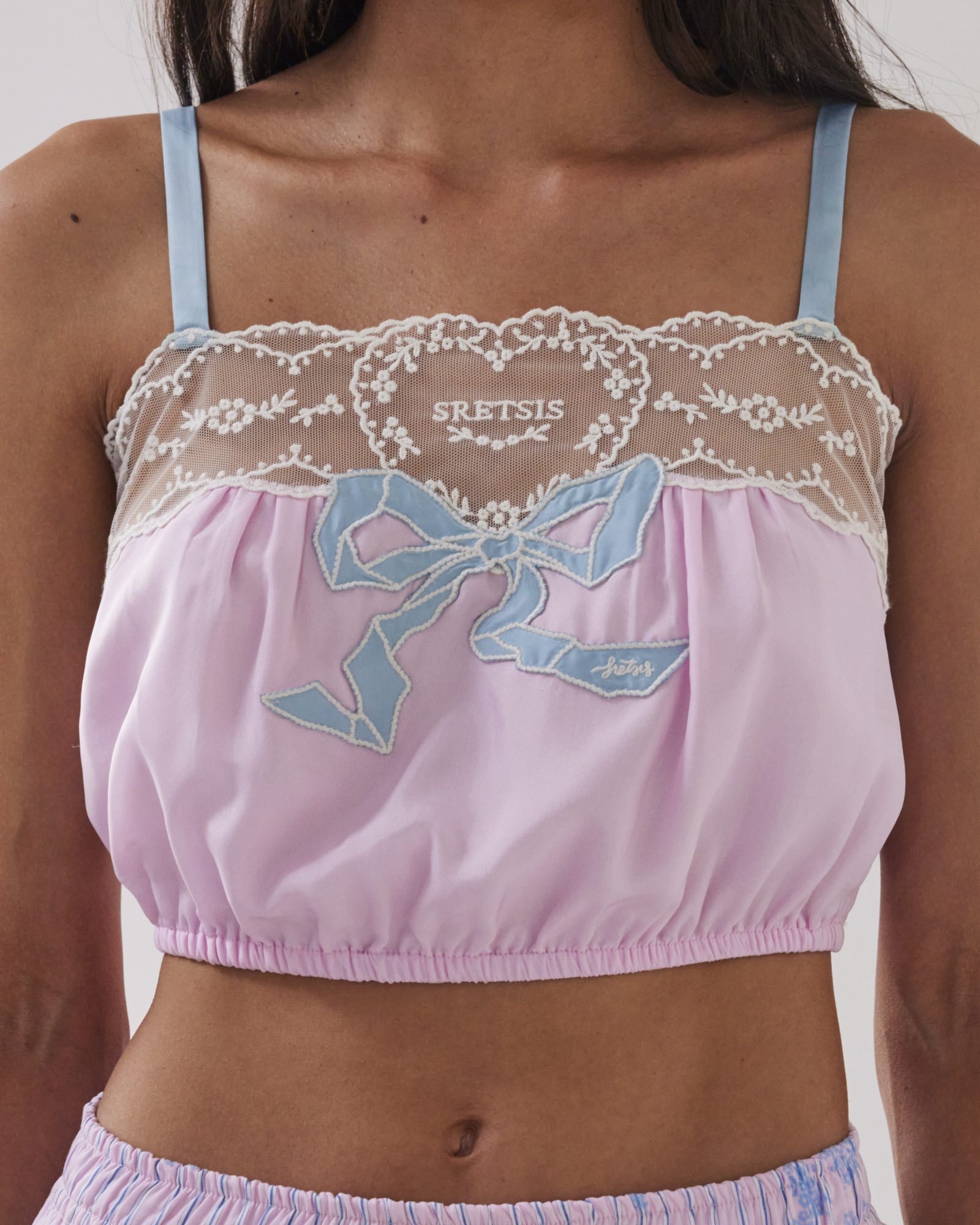 A cropped camisole crafted from 100% Habutai silk, framed with embroidered lace trims and finished with a delicate bow detail at the bodice. Designed for versatile styling, pair it with the BETSY Shorts as a coordinated set, or wear it as a refined base layer beneath your favorite blazer.