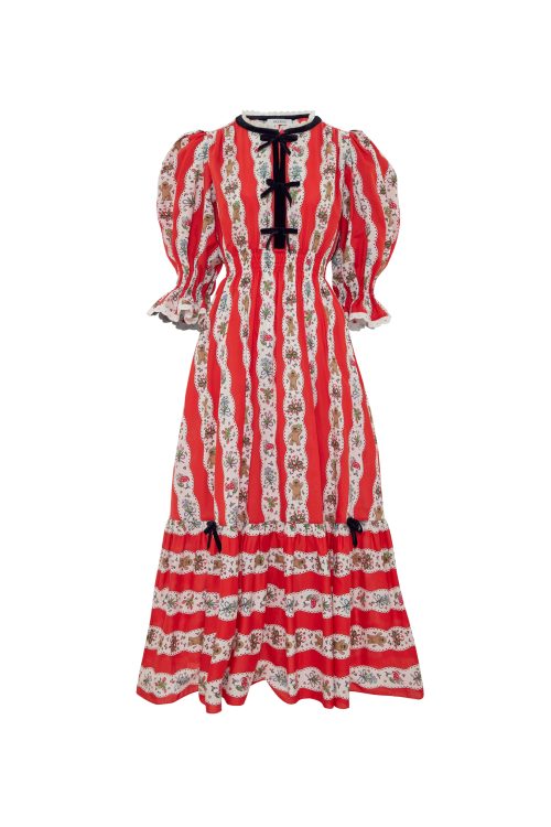 A Christmas midi dress crafted from cotton in the Ludo Candy print, featuring candy cane stripes reminiscent of holiday decorations. Playful details of Mr. Ludo, mushrooms, and rose bouquets bring festive charm, while a bow accent at the front adds a feminine touch. Designed with a smocked waist for comfort, perfect for year-end festivities or special occasions.