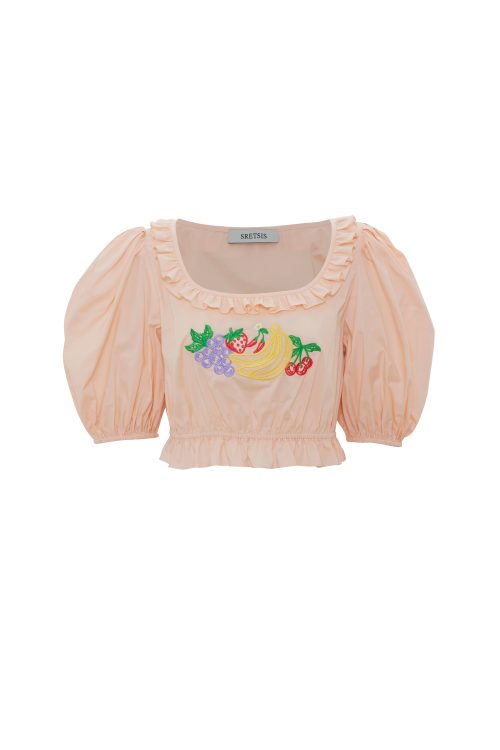 A cropped cotton blouse in a soft peach tone, featuring Mixed Fruit embroidery with voluminous sleeves and a ruffled hem for added structure. Ideal for effortless casual styling pair with HOT CHILLI DENIM PANTS or FRUTTI DENIM SHORT to complete a fresh, resort-inspired look.