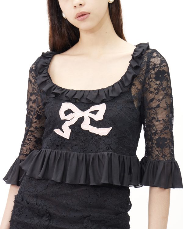 A lace blouse adorned with ruffled detailing at the collar and cuffs, finished with a bow patch at the bodice. Style it effortlessly with your favorite trousers or skirt for a casual look, or elevate the ensemble for special occasions by pairing it with the CHARLOTTE SKIRT.