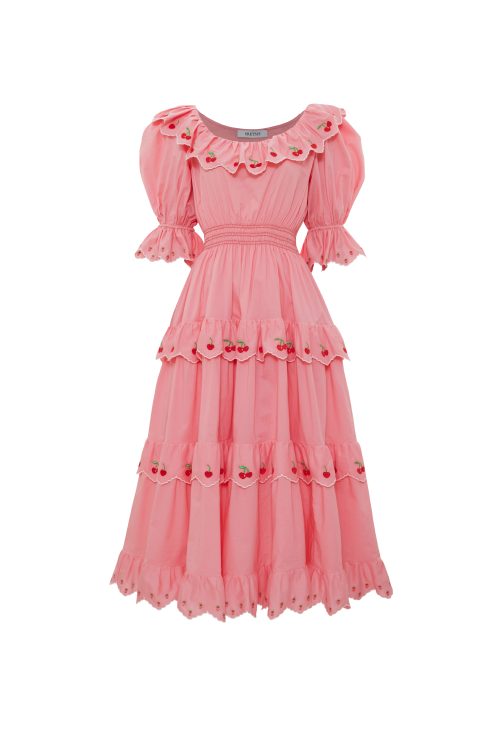 A pink cotton-voile dress in Sretsis’ classic silhouette, designed with ruffle details along the collar, sleeves, and skirt. The cherry embroidery brings a playful Cherry Cake mood to the piece, making it suitable for special occasions or pink-themed events where you want a standout look.