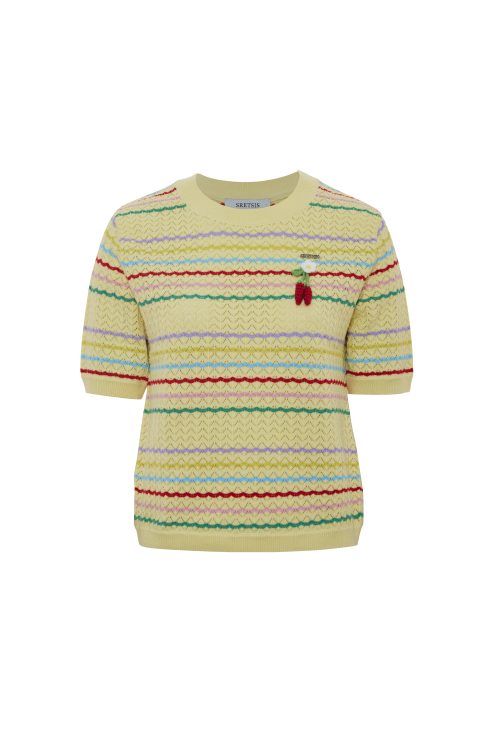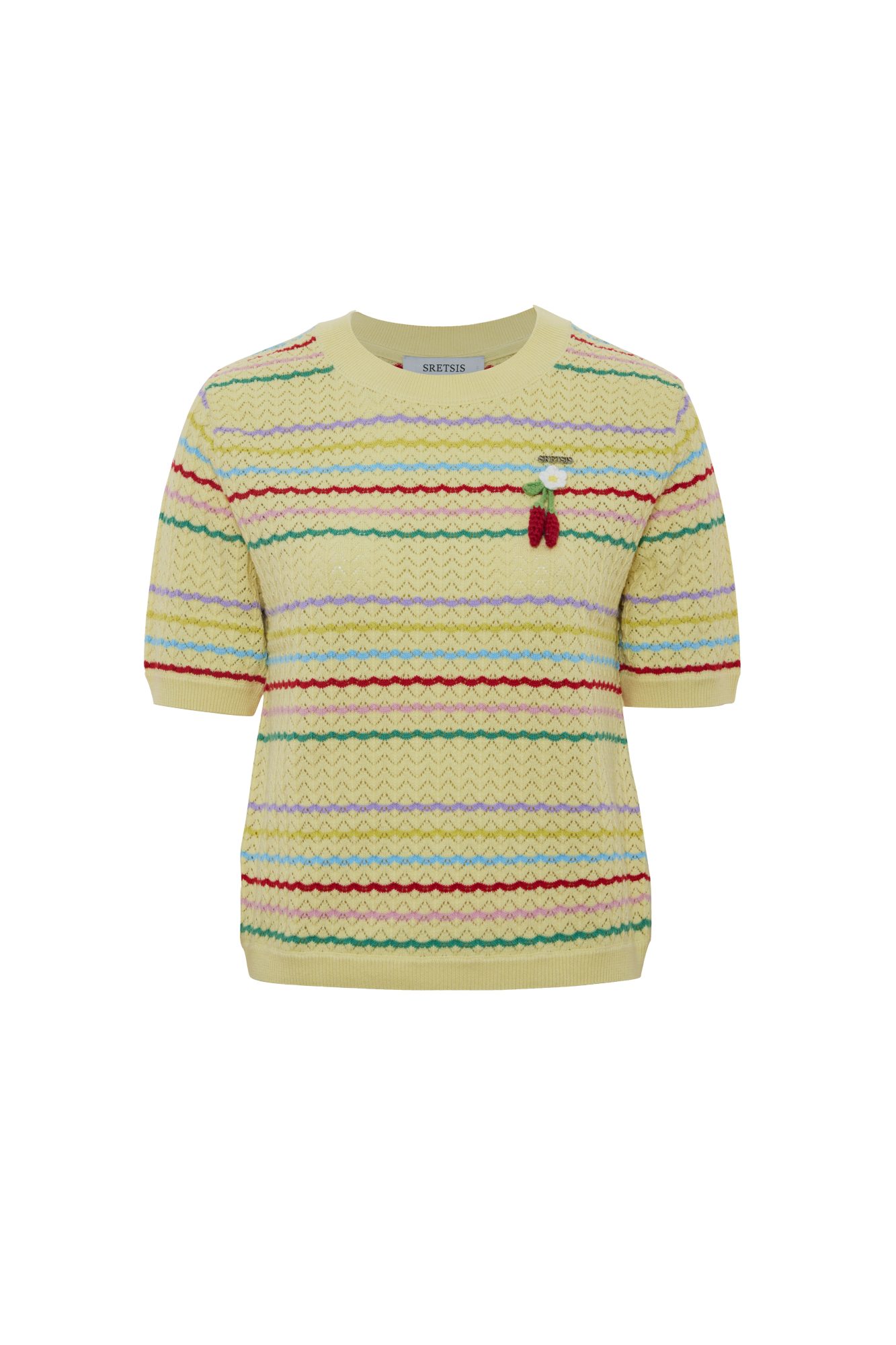 This pale yellow striped knit tee features a signature chili embroidery, a key element of the collection. An essential piece for everyday wear, it styles effortlessly with HOT CHILLI DENIM PANTS, HOT CHILLI SHORTS, or your favorite skirt for a relaxed, easy-going look.