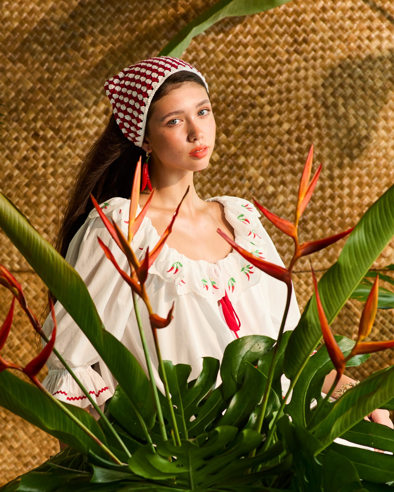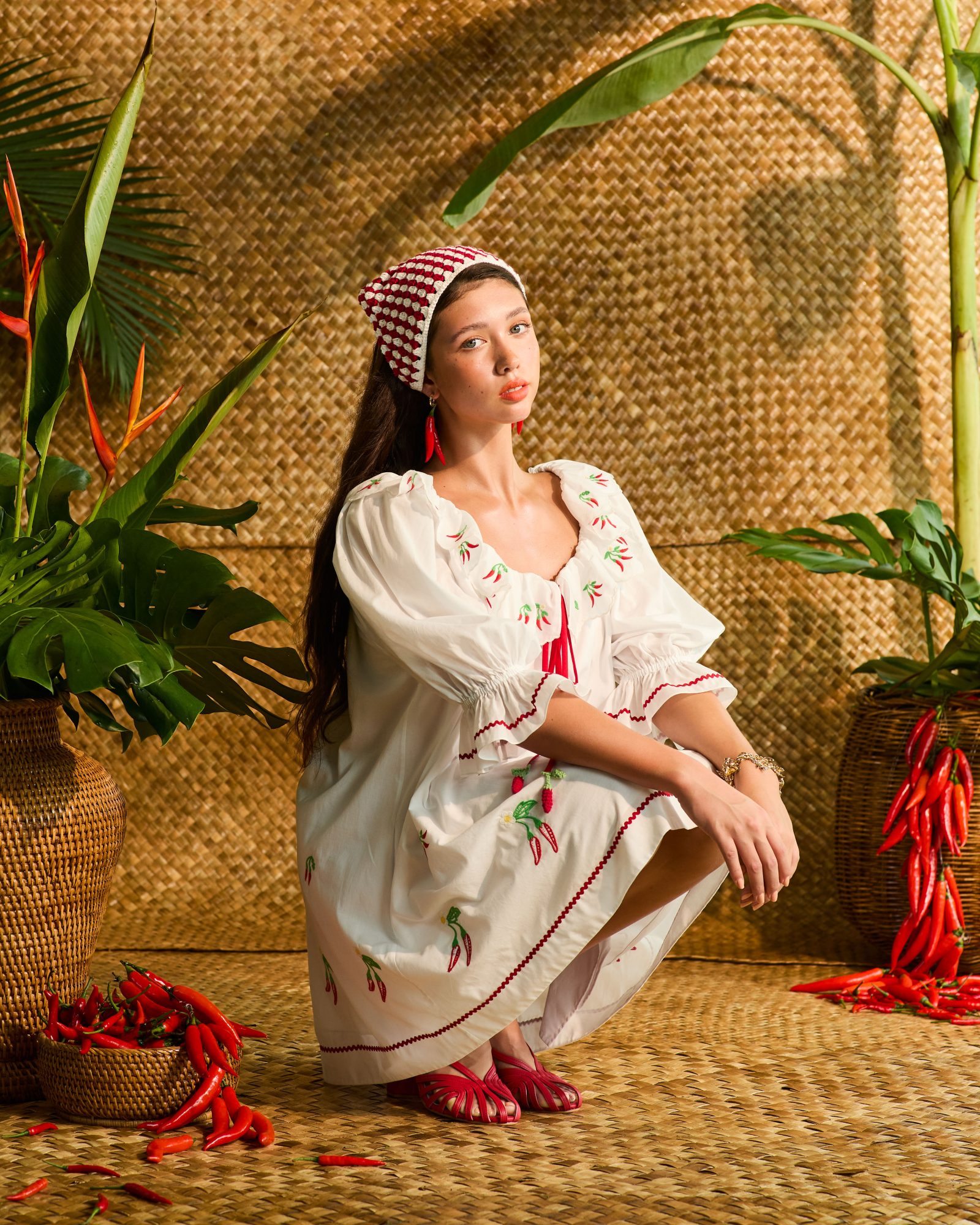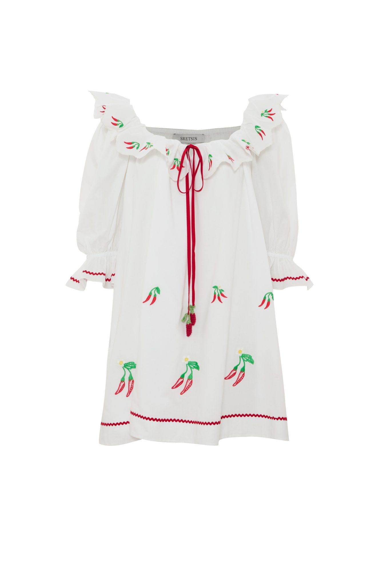 A white cotton-voile mini dress featuring chili embroidery along the collar and hem for a distinctive touch. Versatile enough to pair with long trousers or shorts for added styling possibilities. Ideal for relaxed days when you want an effortless look with playful details.