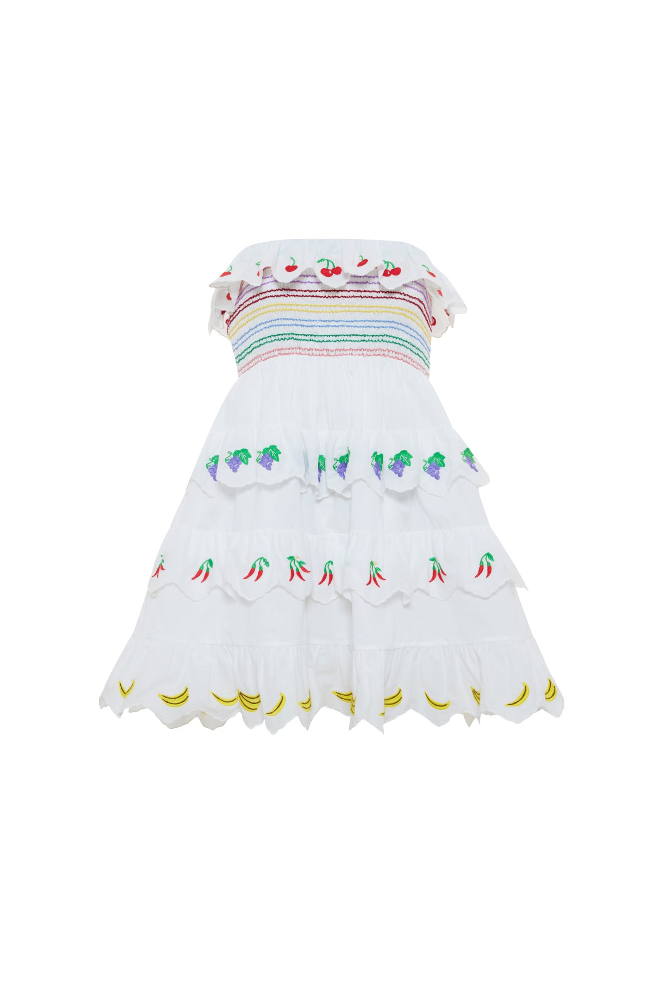A white cotton-voile strapless mini dress featuring a smocked bodice for comfort and ease. The signature Mixed Fruit embroidery highlights the piece starting with cherries at the chest, followed by tiered ruffles adorned with grapes, chili, and banana motifs, echoing the playful Fruitcake theme of the collection. Perfect for resort getaways and easy to layer with your favorite cardigan or a crisp white shirt.