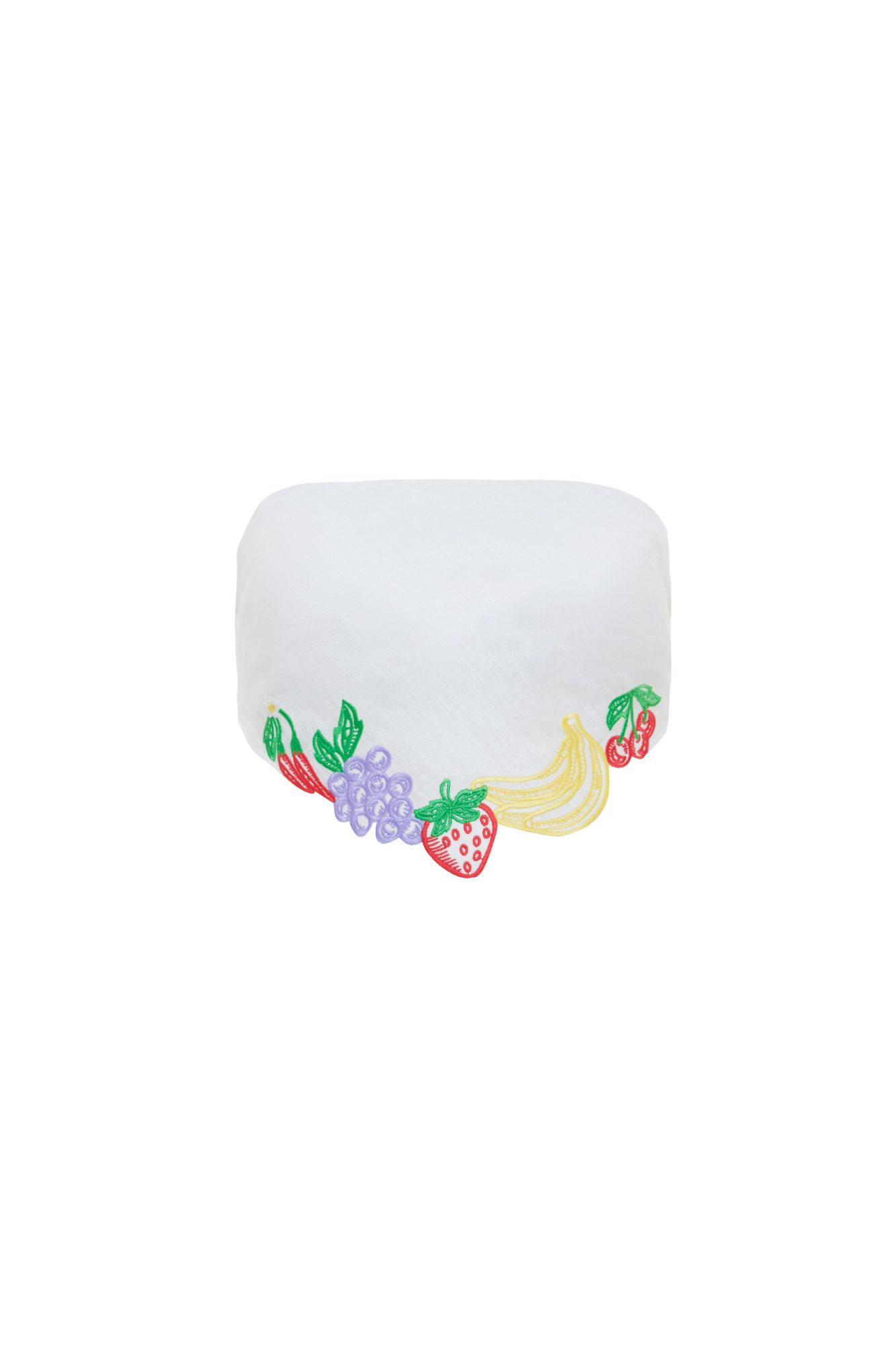 A linen triangle bandeau top featuring Mixed Fruit embroidery, ideal for a relaxed resort look with a subtle bold twist. Perfect for vacation styling and recommended to pair with the À LA MODE SKIRT for a complete resort-ready outfit.