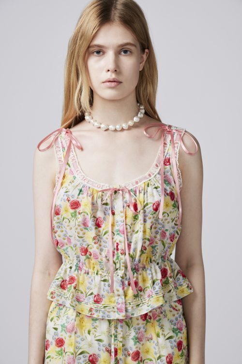 Featuring the delicate DAISY LILY, LILY ROSE print in the Summer Blooms colorway, this sleeveless top is crafted from airy 100% cotton gauze. Intricate SRS lace trim and pink ribbon ties add charm, fastening into bows at the shoulders and chest. Pair with denim or the matching Lover Blooms Shorts for a casual-chic.
