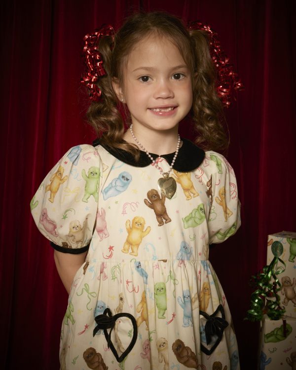 festive Ludo’s Party mini dress for girls, crafted from 100% cotton with cheerful holiday charm. The design features a black velvet collar and sleeve edges, complete with a tiny heart-shaped pocket at the waist, a playful signature touch. Comfortable to wear and perfect for Christmas gatherings or any joyful day.