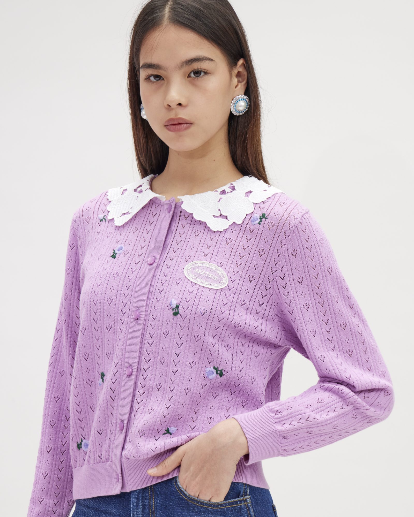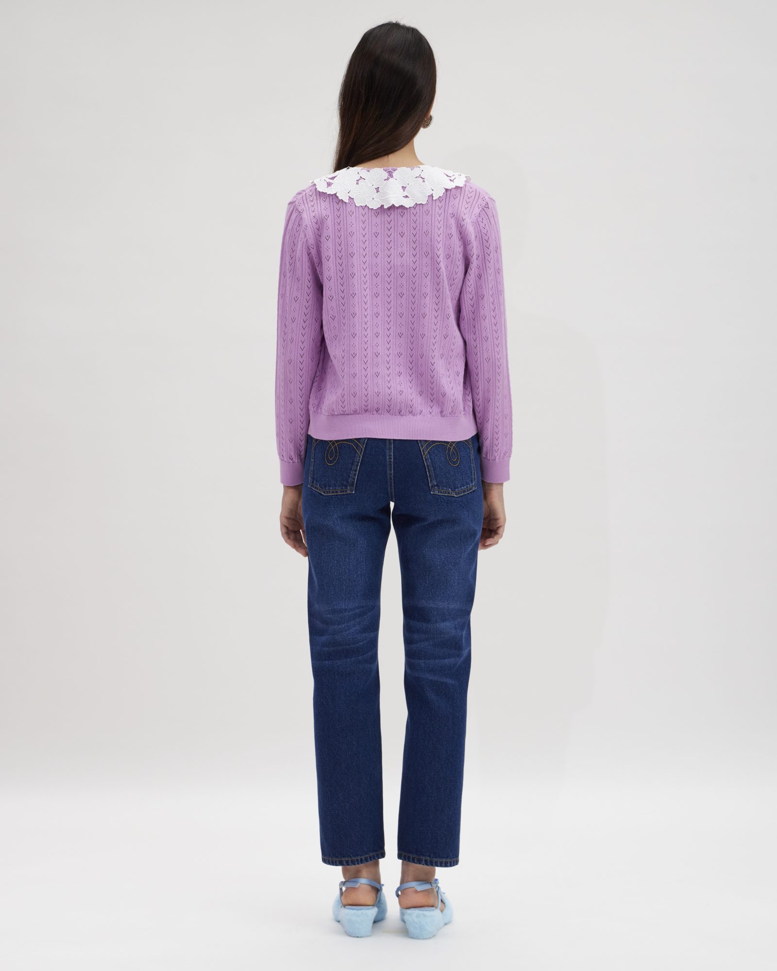 A knit cardigan adorned with the delicate ROSA FIELD GUIPURE Peter Pan Collar and finished with CROSS STITCH ROSEBUDS embroidery across the bodice. Designed to be worn on its own or layered over your favorite camisole, it pairs effortlessly with denim, skirts, or the ROSETTE KNIT SHORTS for a coordinated ensemble.