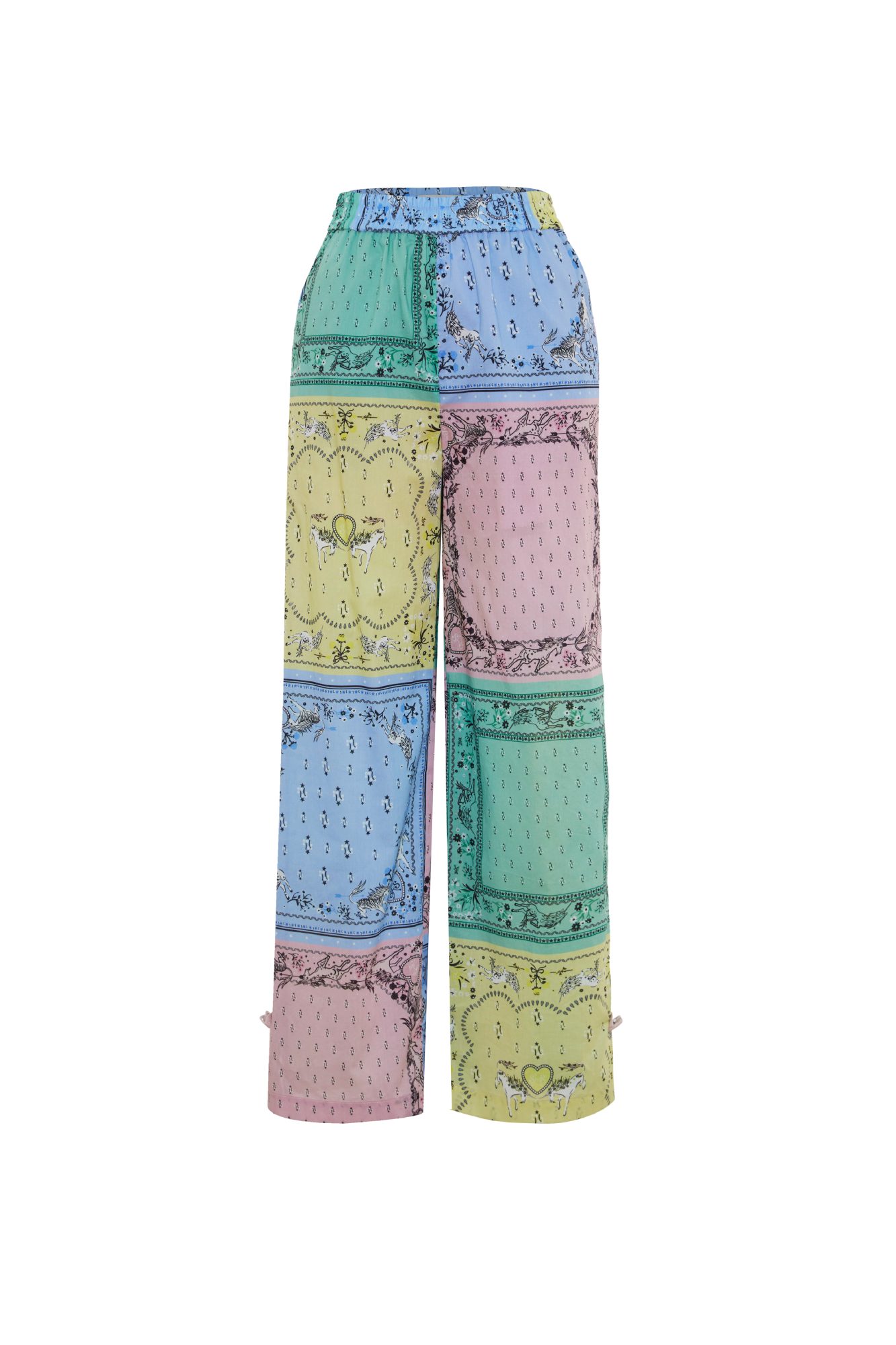 The Unicorn Bandana printed cotton pants in Pastel Mix, named “Lao Gong” designed as part of the Lunar New Year selection. The playful pastel palette and fantasy-inspired print bring a festive touch while ensuring comfort for all-day movement. Style effortlessly with the UNICORN LUNA BLOUSE or the LAO GONG SHIRT for a complete coordinating look.