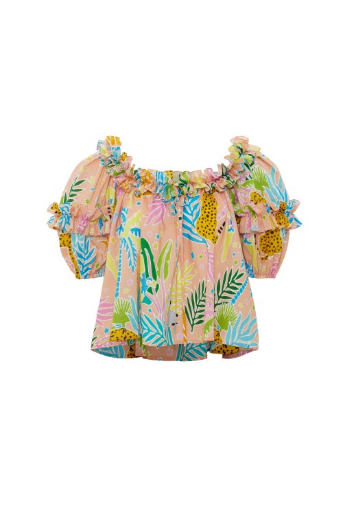 The Star Jungle printed cotton blouse features ruffle detailing along the neckline and sleeves, finished with a front tie for added character. Designed with a relaxed, resort-friendly feel, it pairs effortlessly with the SAMUI SARONG SKIRT for a refined yet easy tropical look during your holiday.
