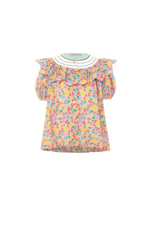 A girls’ mini dress crafted from lightweight cotton voile, featuring the Tutti Frutti print in Pink Berry. The design is highlighted by a ruffled collar detail across the chest, adding movement and a lively character to the look.