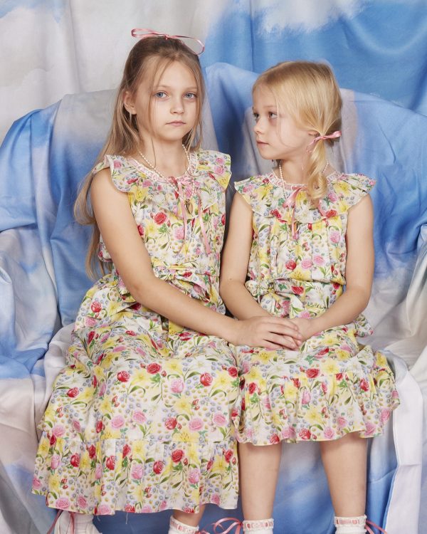 A sleeveless dress for little girls radiates summer joy with DAISY LILY and LILY ROSE prints. Featuring a collar and ruffled hem, it adds depth to the enchanting silhouette. Complete with a matching tie belt, it pairs beautifully with the matching dress from the Sretsis Spring-Summer 2025 collection for mothers, creating a coordinated mother-daughter look to celebrate warm moments in style.