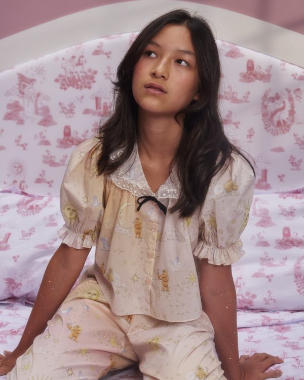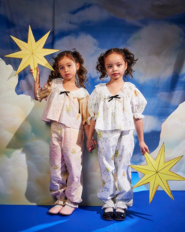 A cropped cotton blouse in the LUDO MOON AND STAR print, finished with a rose lace collar and a delicate black bow at the chest. Style it with the matching LULALA PANTS for a coordinated look that can be twinned with mom.