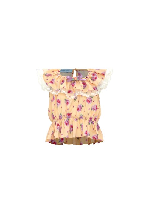 A sleeveless blouse for girls crafted from cotton in the SRETSIS ROSEBUDS IKAT print, presented in Peachy Keen. Designed with soft ruffle detailing along the neckline and finished with a pink bow accent, this piece brings a spirited yet polished character. Style it with the Little Rosehaze Chong Kraben for a coordinated ensemble.