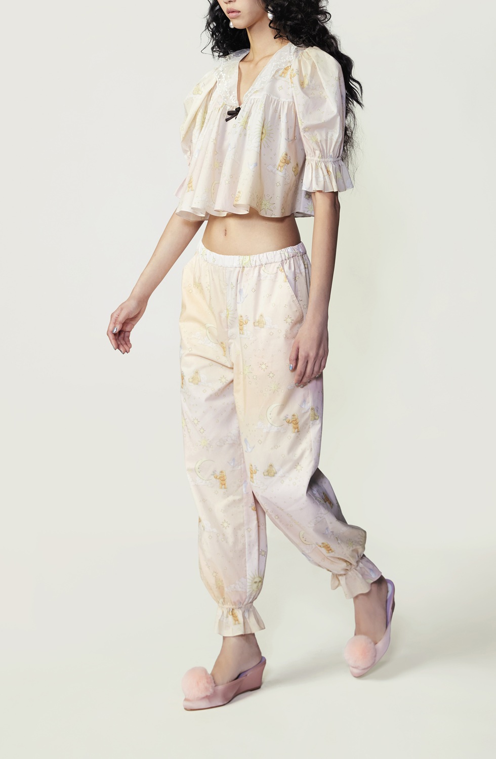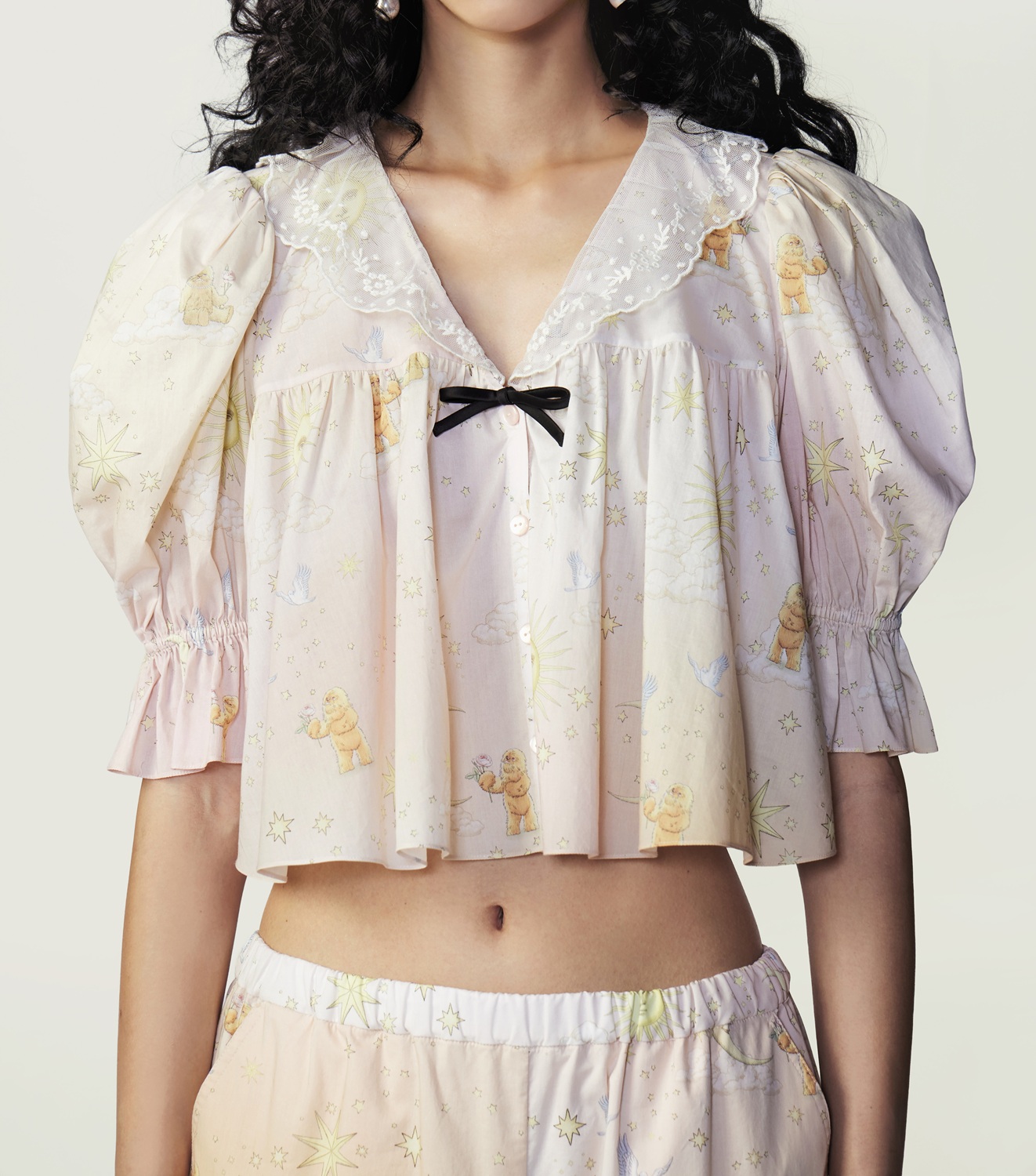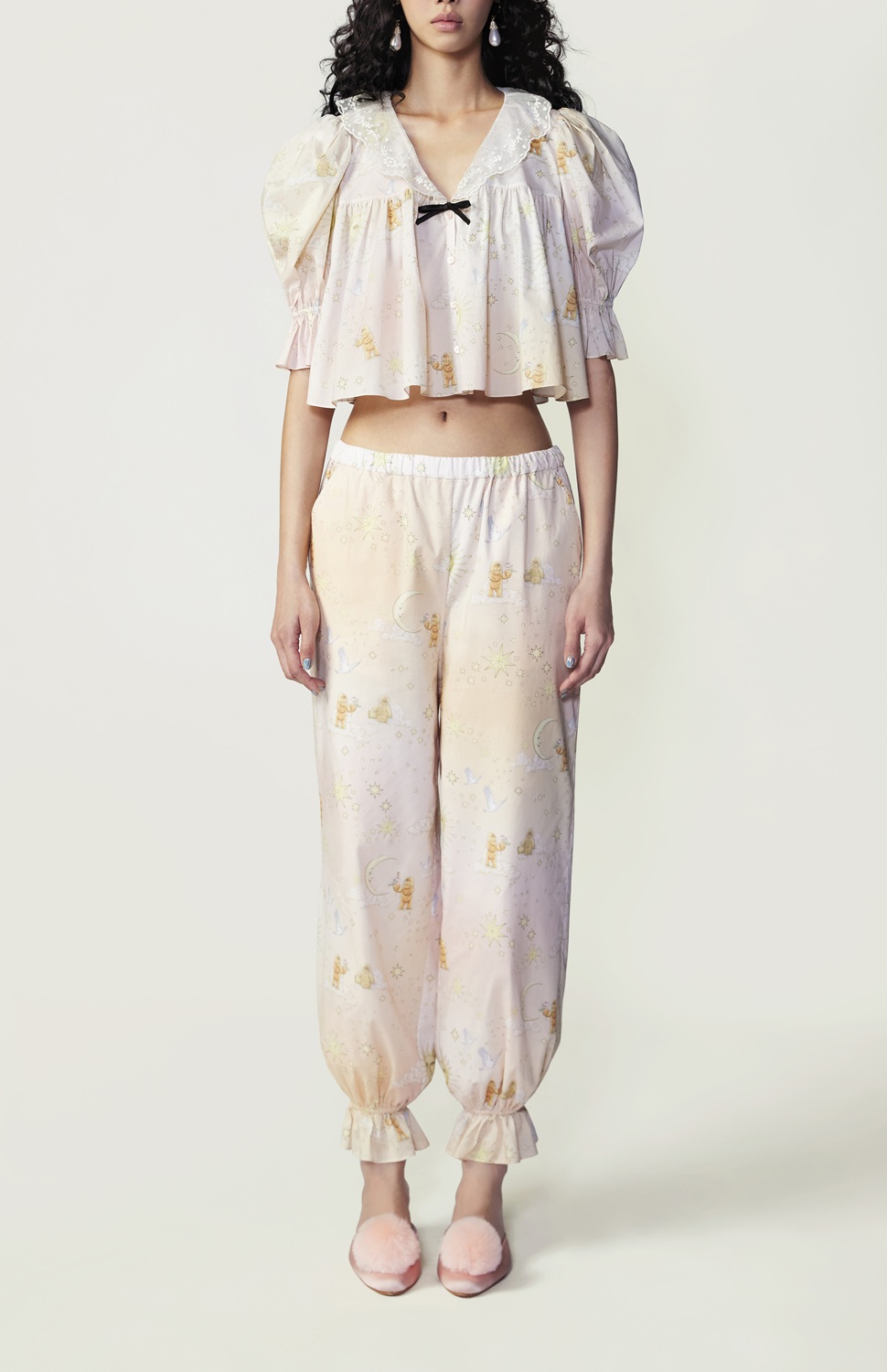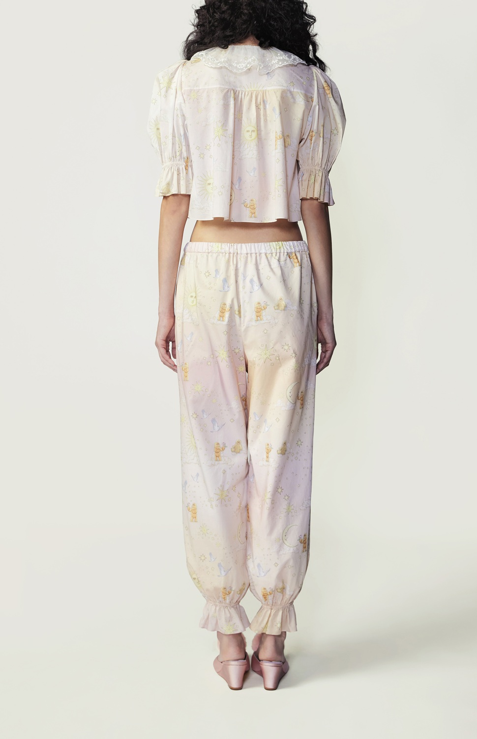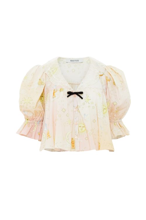 The cropped blouse in 100% cotton features the enchanting LUDO MOON AND STAR print. A rose lace collar lends a touch of vintage, while a delicate black bow at the chest. Pair it with the matching LULALA PANTS and complete the look with your favorite headband for a coordinated fantasy-meets-cool ensemble.
