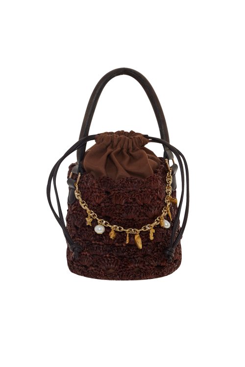 The Dark Brown basket bag features a classic woven design, highlighted with gold hardware straps and charms shaped like starfish, seahorses, and shells, adding a playful and distinctive touch to any outfit.