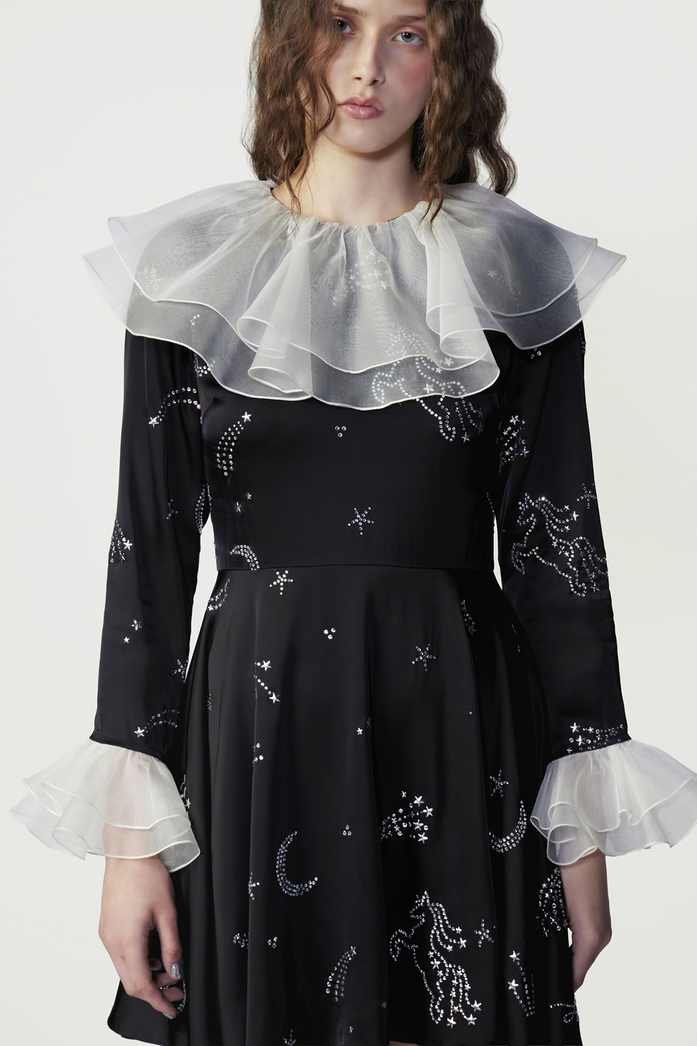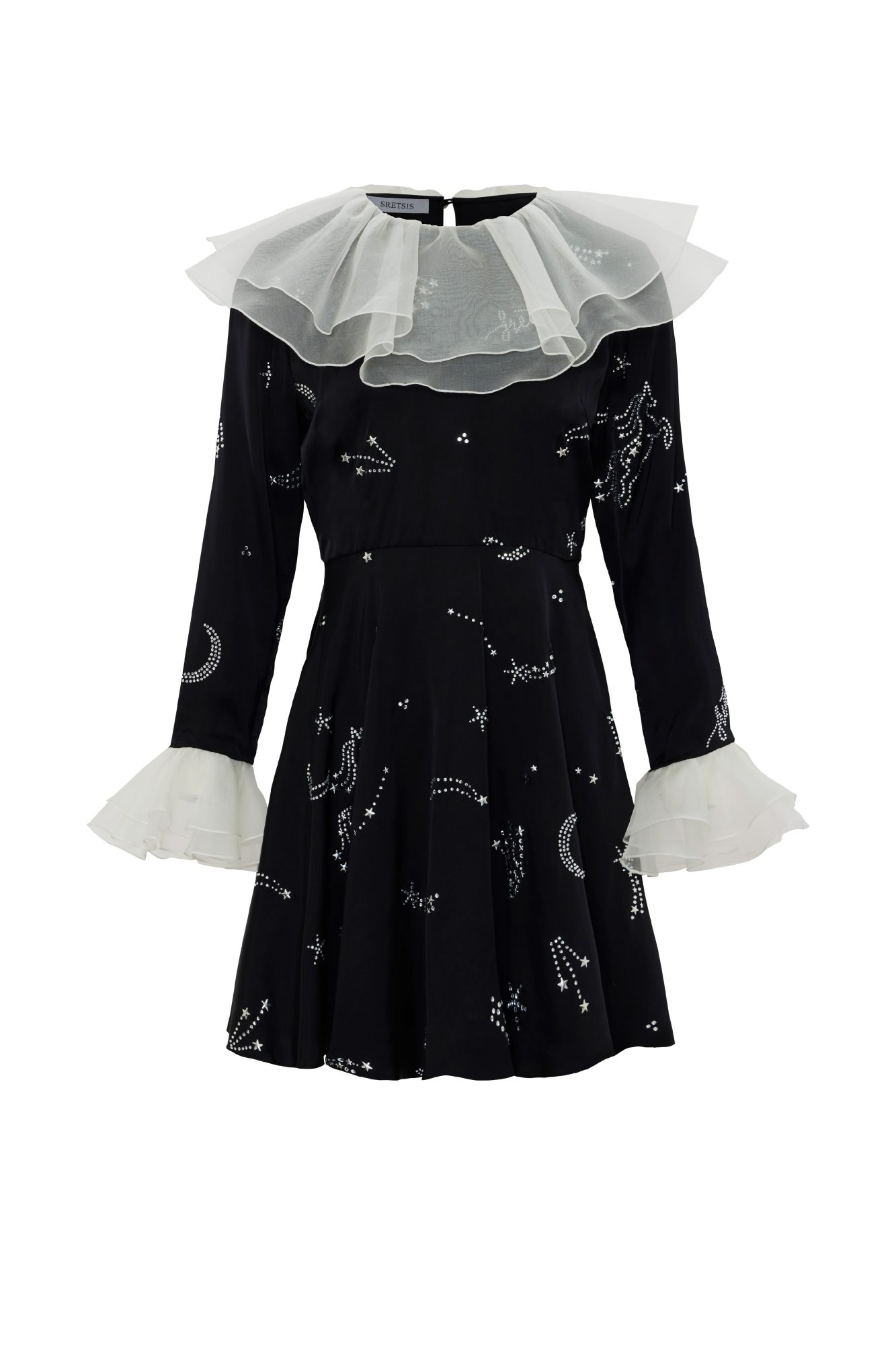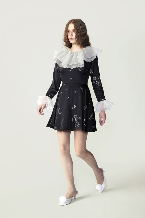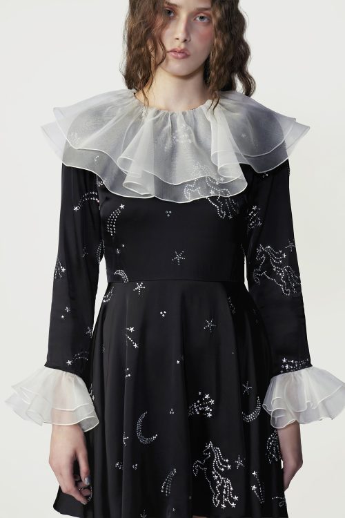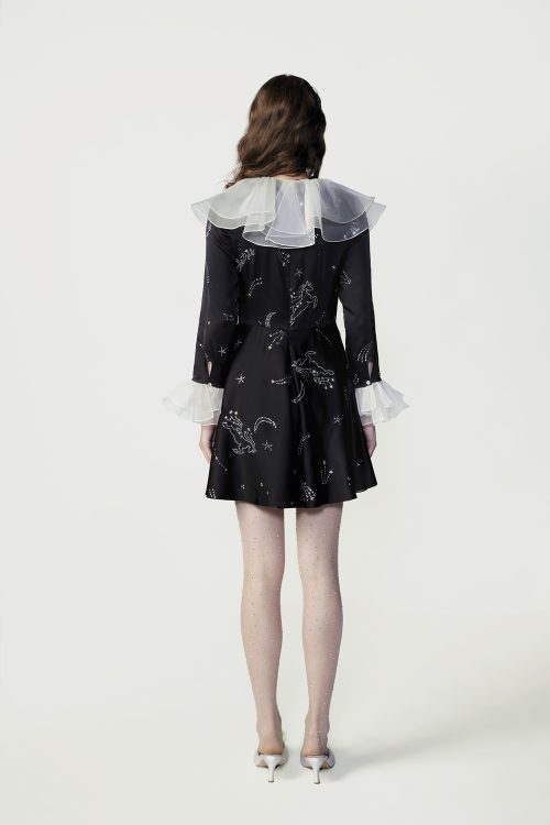 A black viscose mini dress designed for refined cocktail moments. Featuring Hot Fixed Crystals in the STARDUST COMET pattern, it channels cosmic elegance. White chiffon ruffles at the neckline and cuffs add contrast, while the tailored silhouette ensures a polished, graceful presence.