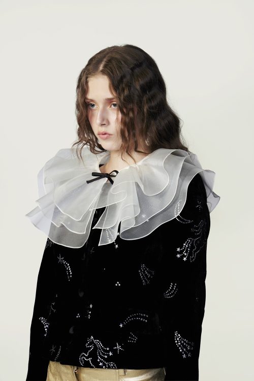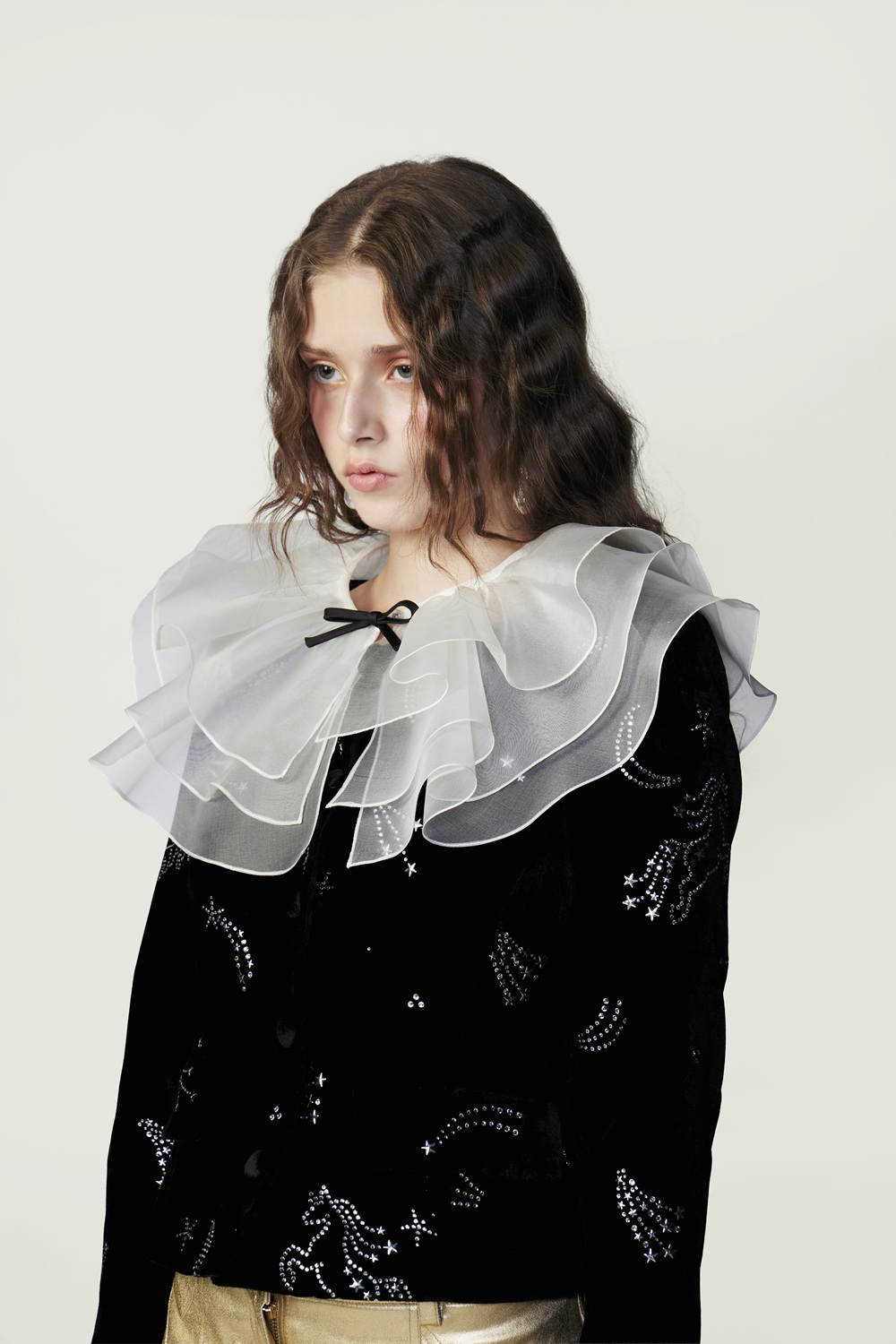 A statement collar that adds playful dimension to your styling. Perfect for layering over knits, blouses, or your favorite dresses, elevating any outfit with distinctive charm and flair.