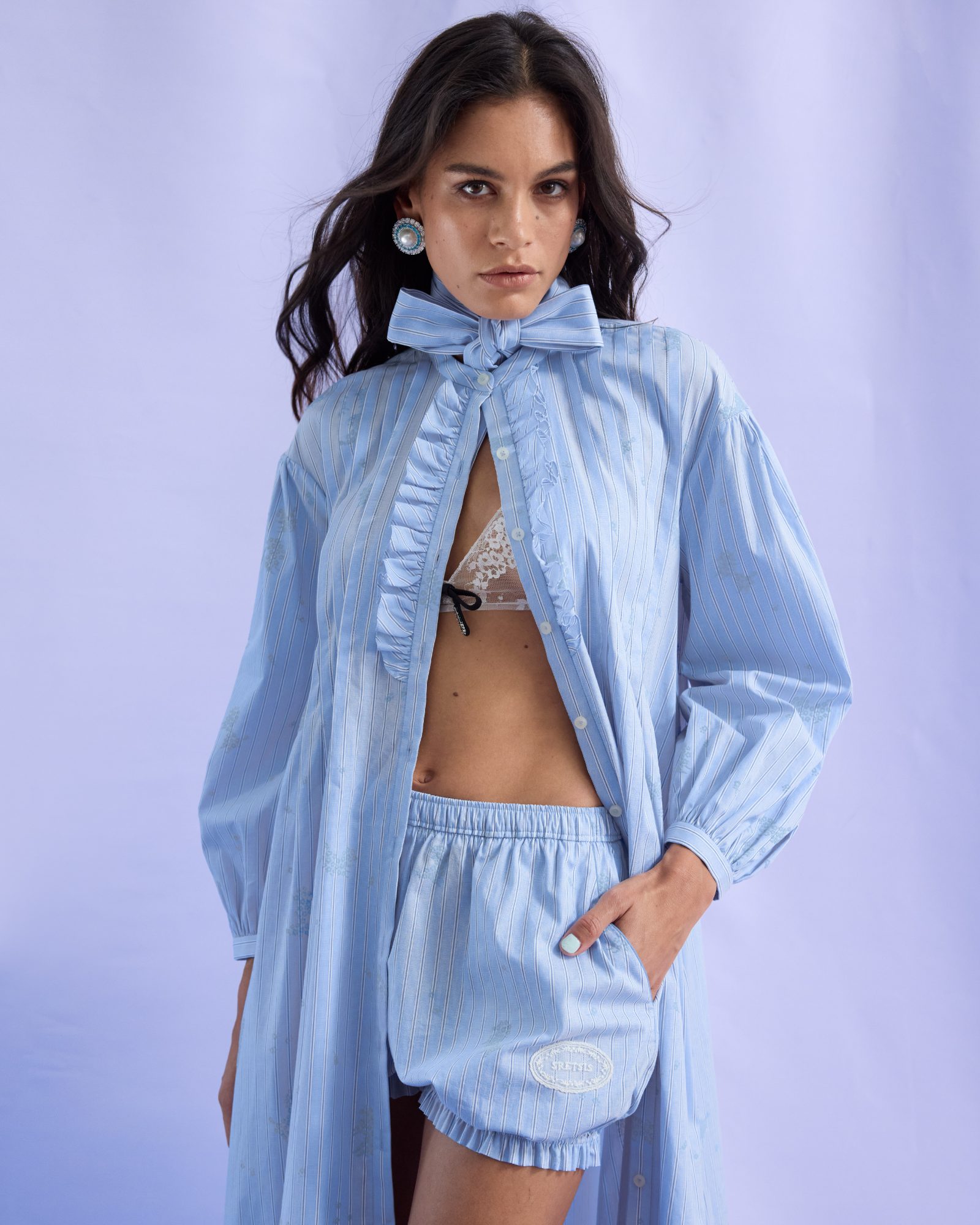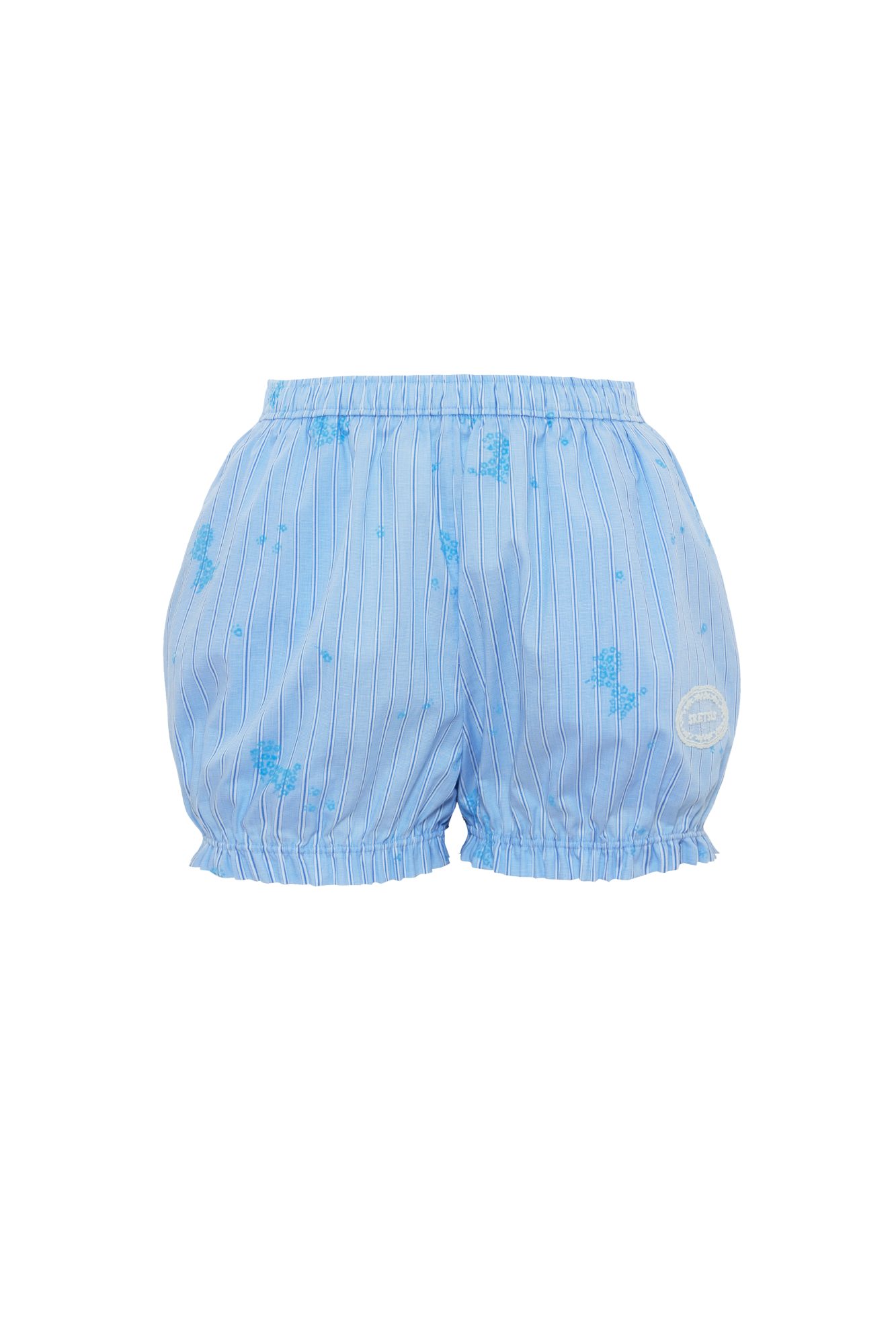 Cotton bloomers in the LADY DAISY POODLES print in Blue Poodle, accented with flocking details of petite paw prints and daisy motifs. An essential piece designed for versatile everyday styling. Pair them with the POODLE RUFFLE SHIRT DRESS or the CROPPED WHITE COLLAR SHIRT for a coordinated look.