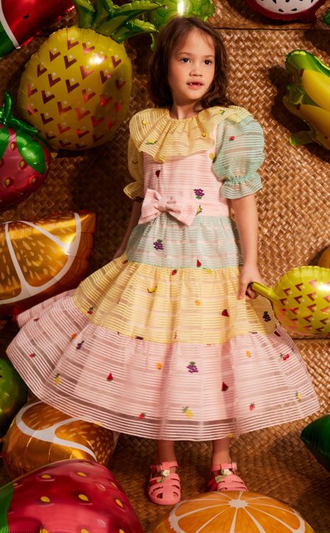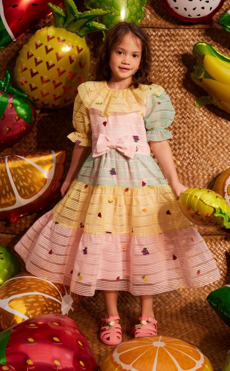 A long dress for girls in a Rainbow Fruity color palette, designed for special occasions. Featuring layered pastel fabric details that create dimension and a vibrant, colorful look—perfect for memorable days.