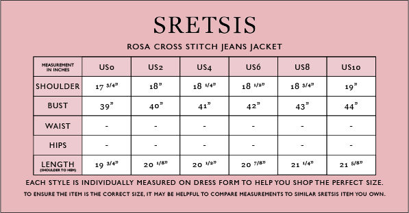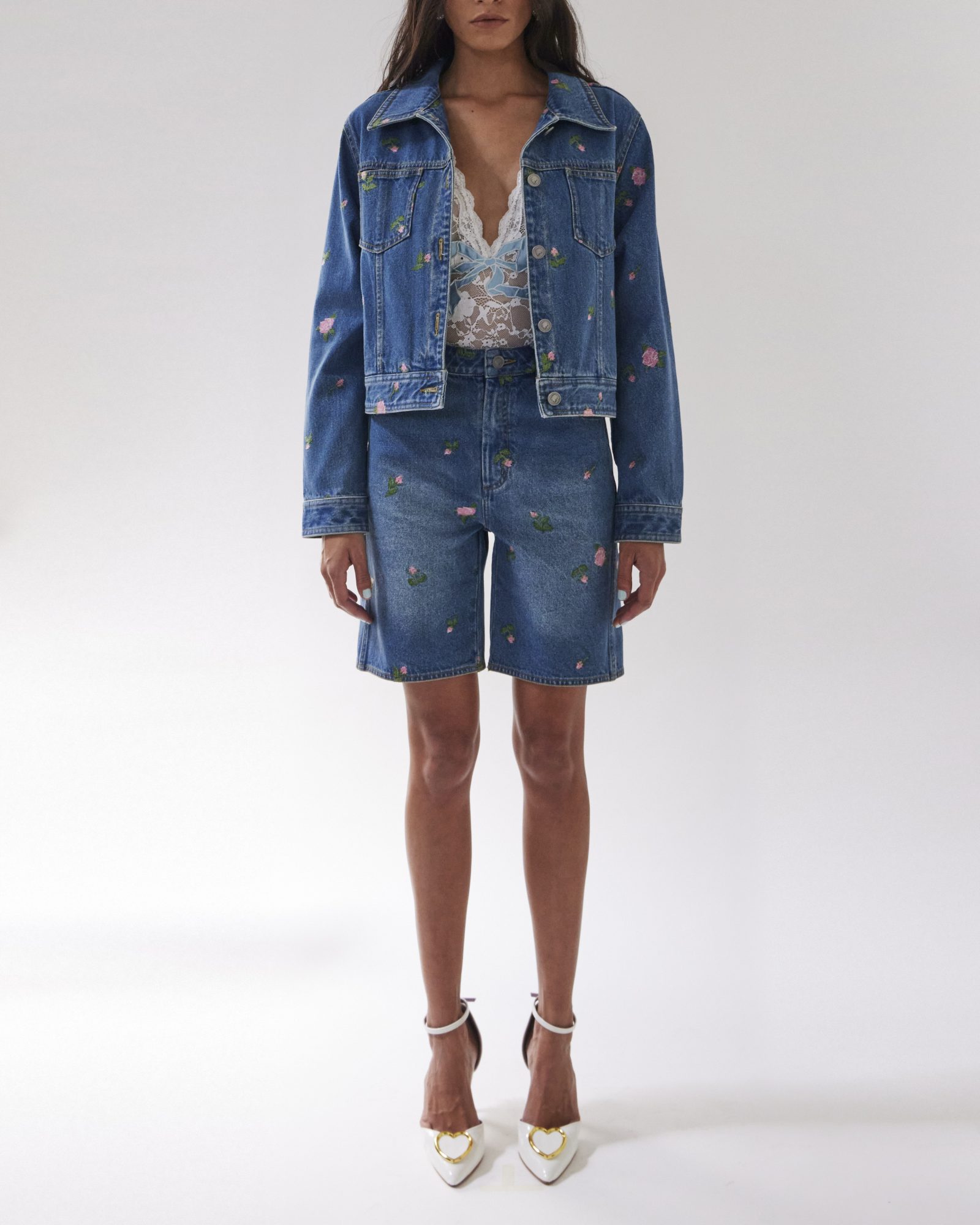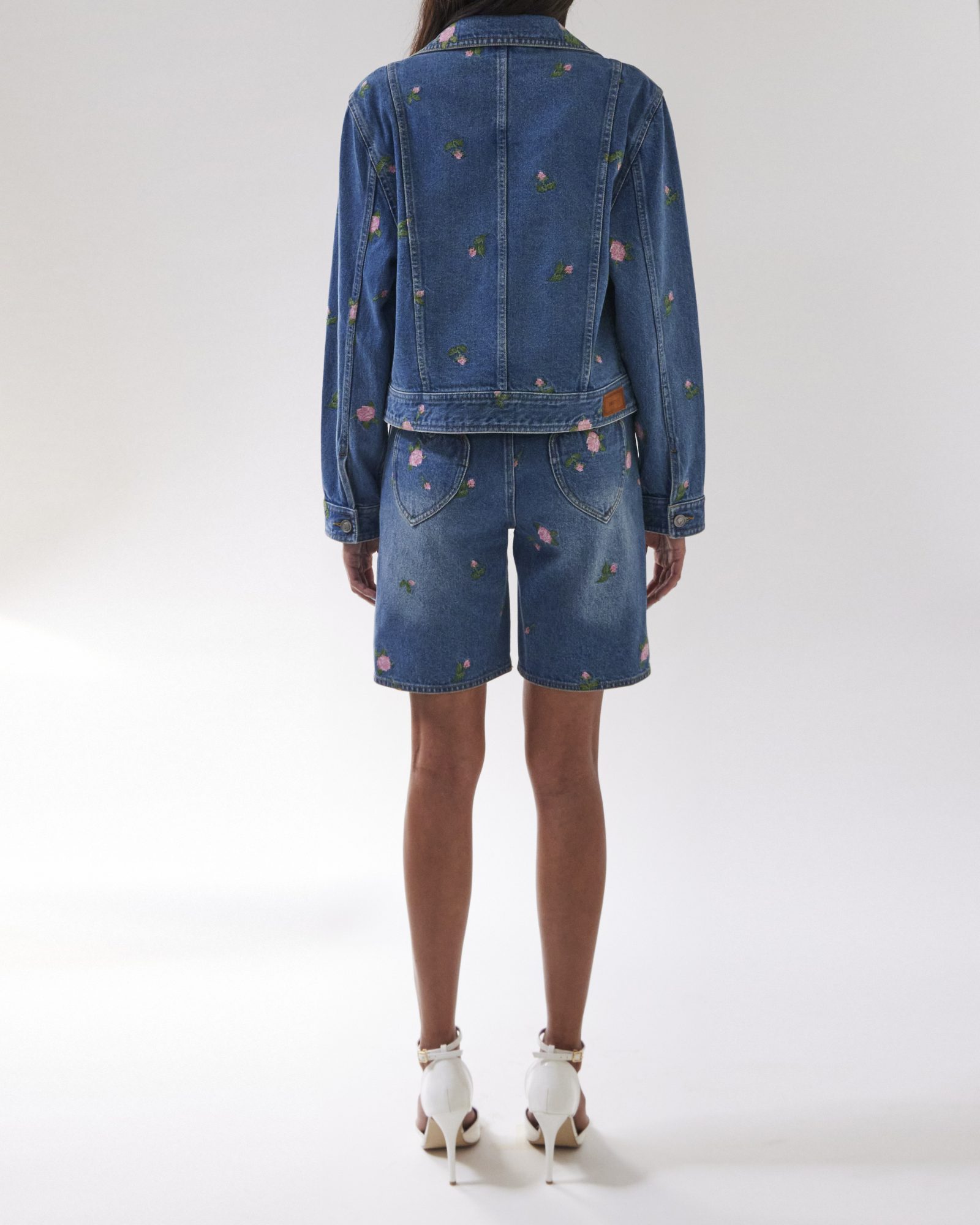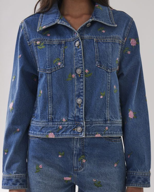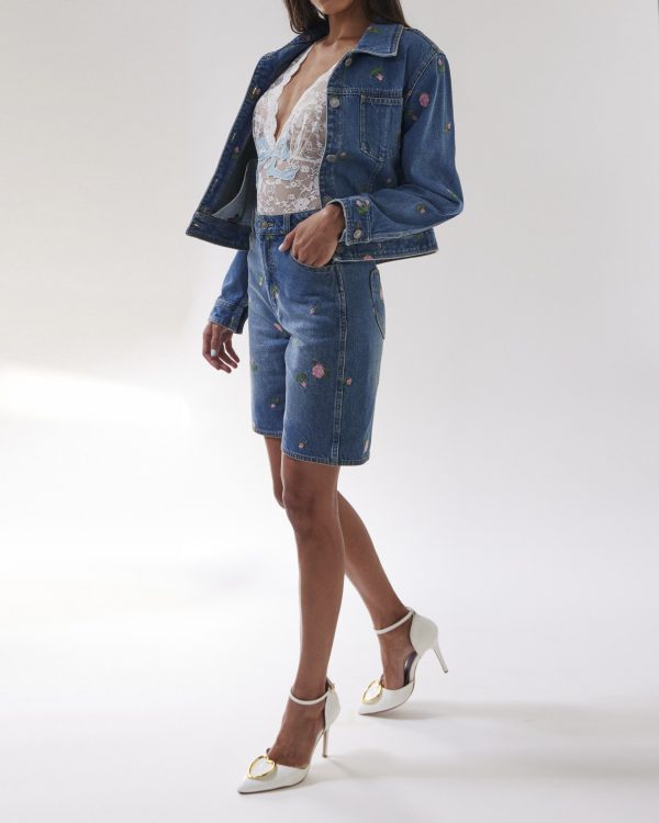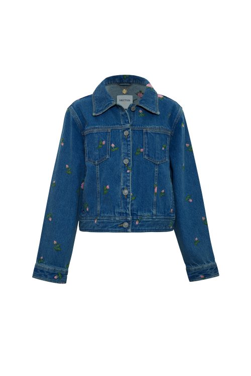 A light blue denim jacket detailed with CROSS STITCH ROSEBUDS embroidery, designed as an essential piece for versatile styling across occasions. Pair it with the ROSA CROSS STITCH SHORTS or jeans for a coordinated ensemble.