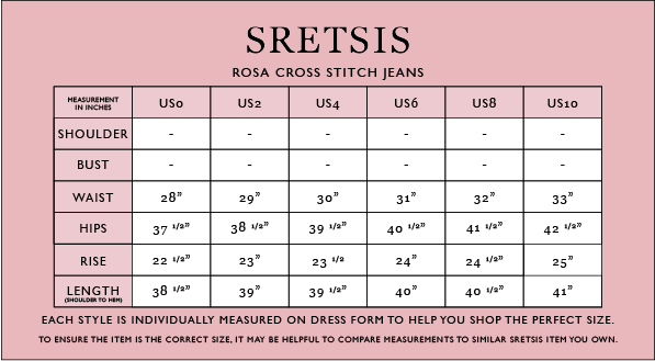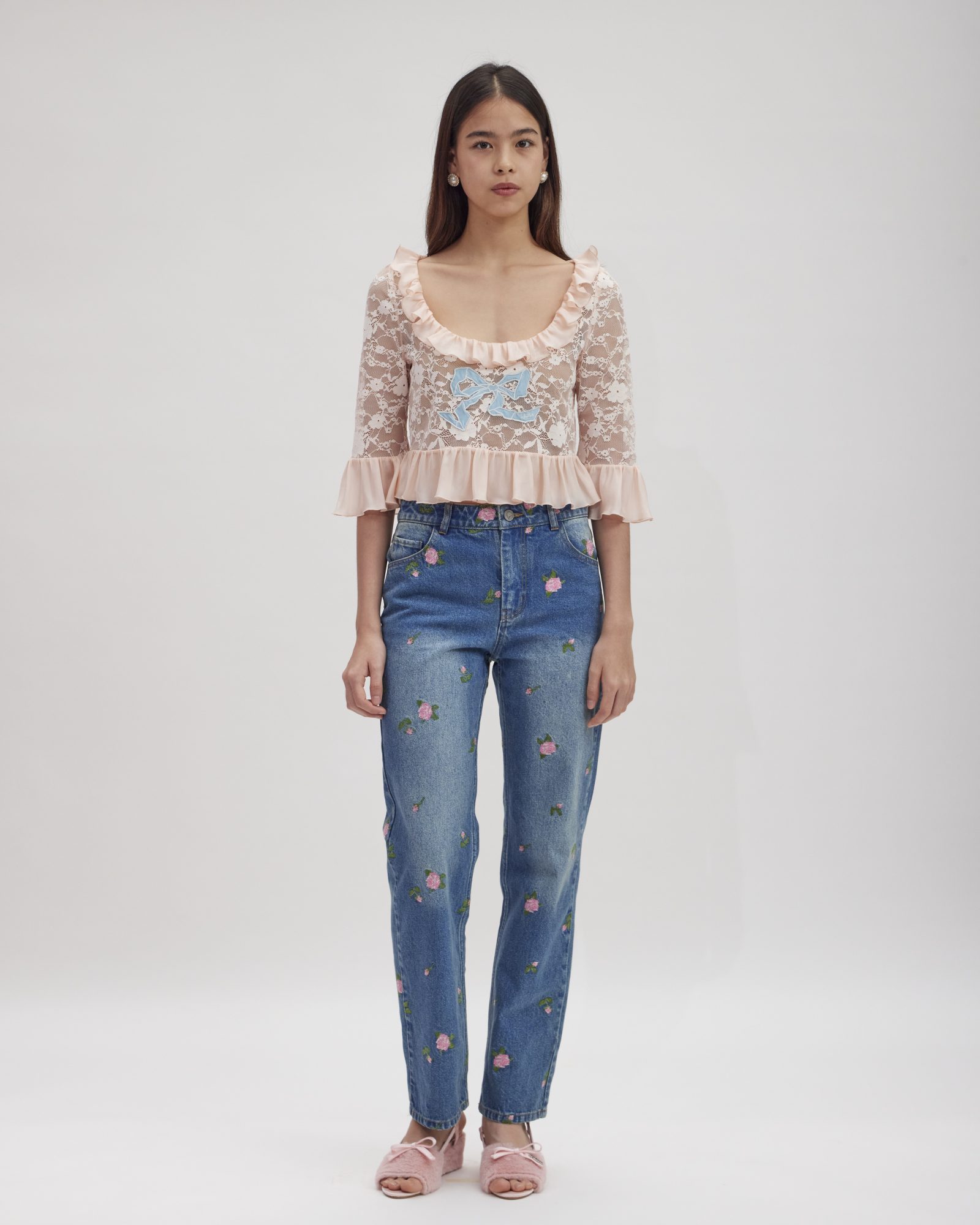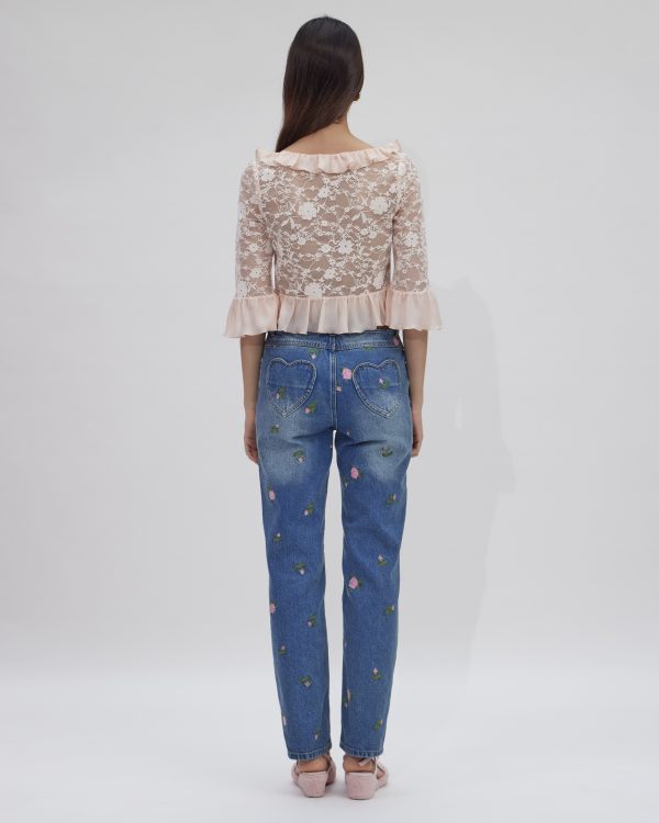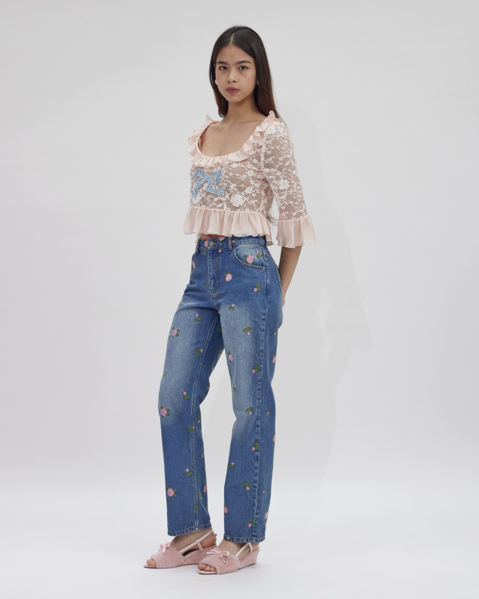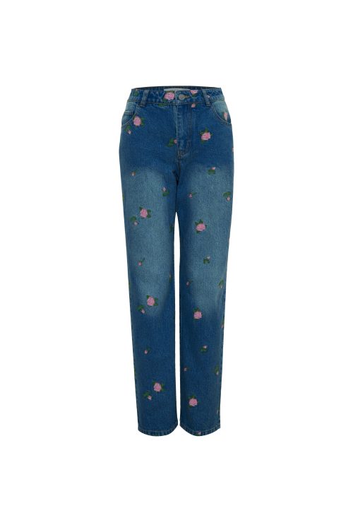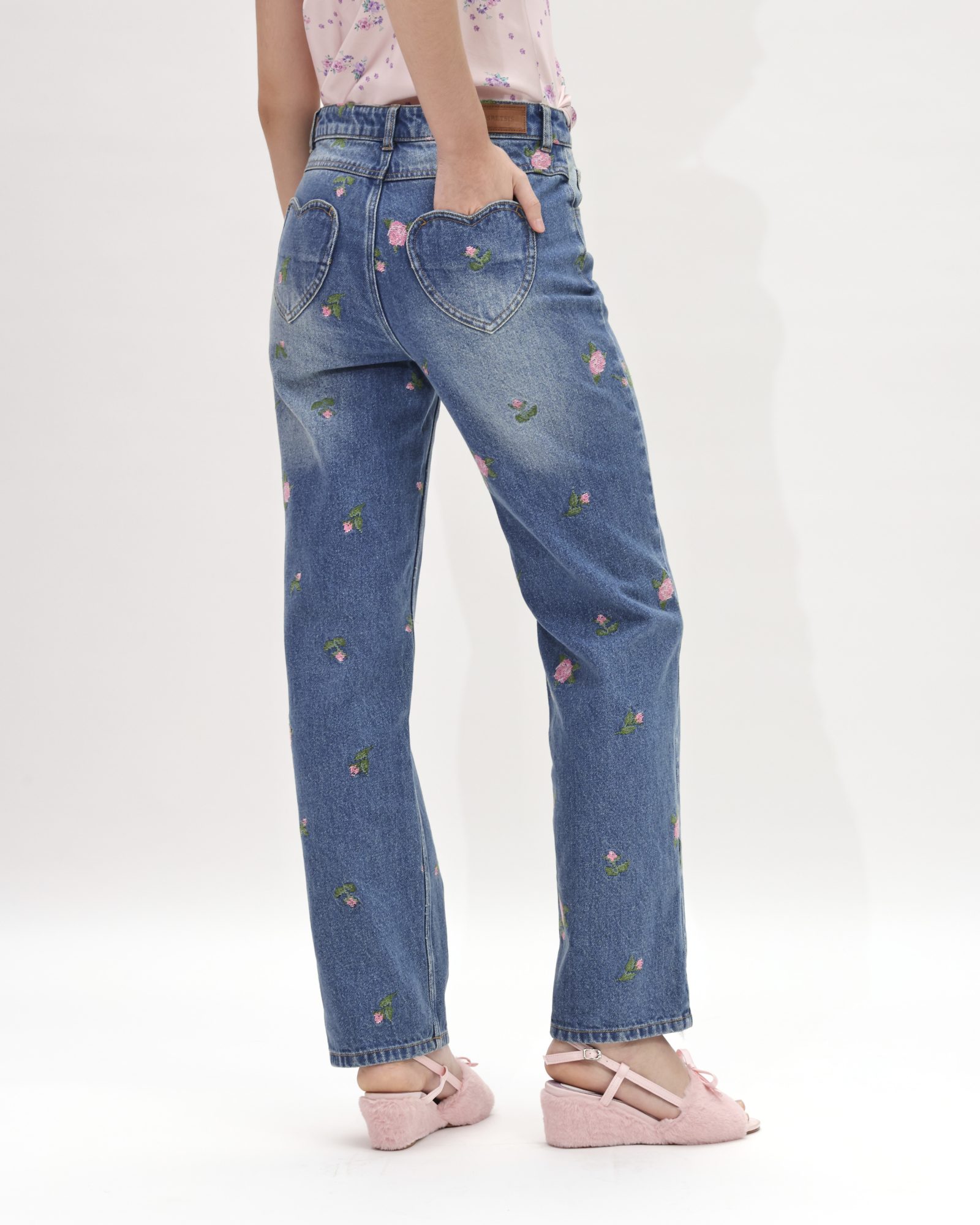 Another piece destined to become your favorite, these light blue jeans are detailed with CROSS STITCH ROSEBUDS embroidery, offering a distinctive accent to elevate everyday styling. Versatile by design, they pair effortlessly with your favorite T-shirt or blouse, or can be styled as a set with the ROSA CROSS STITCH JEANS JACKET.