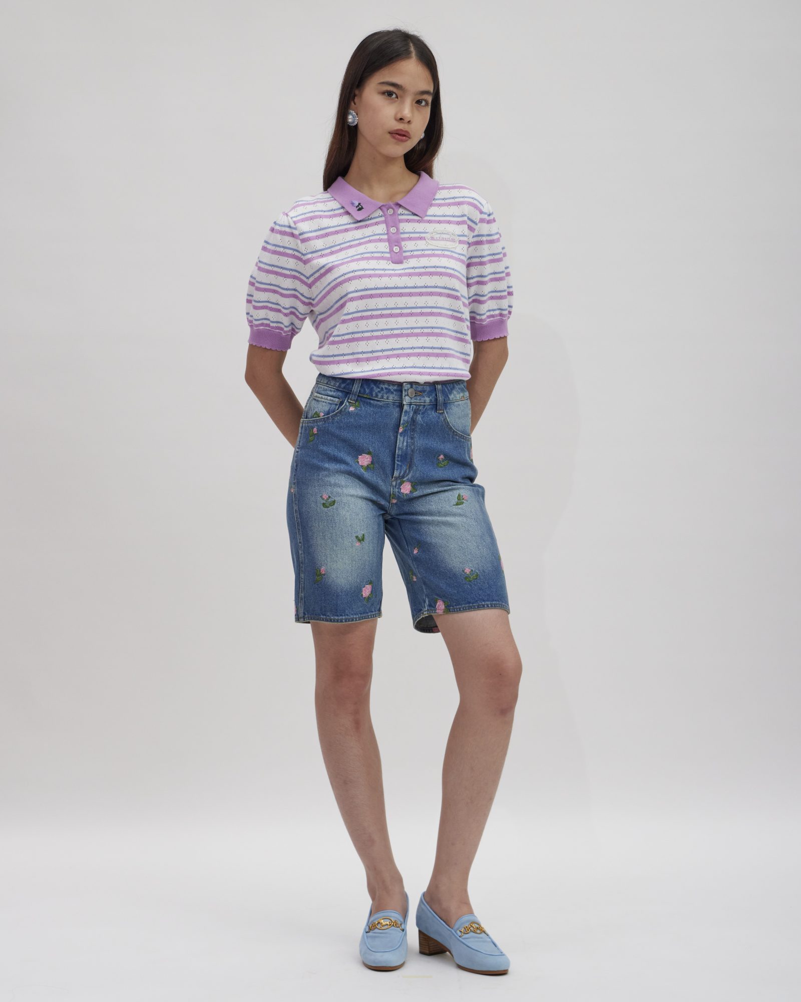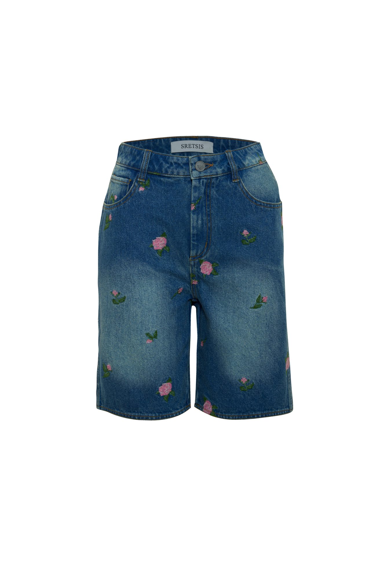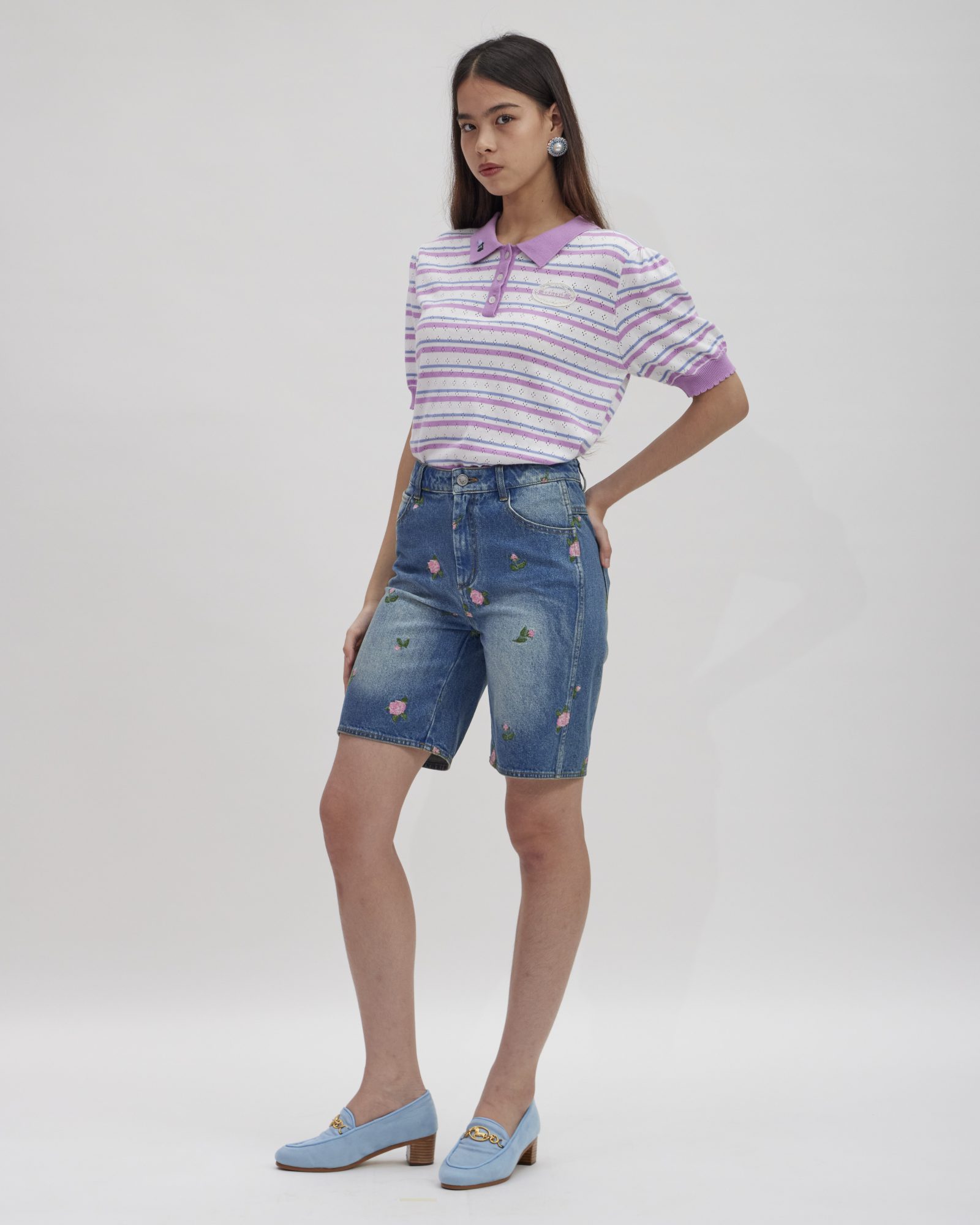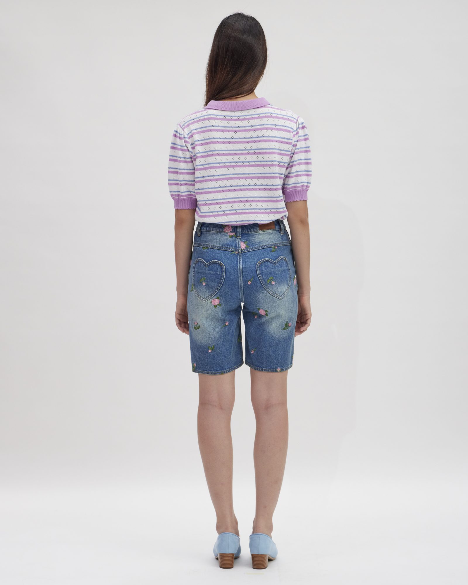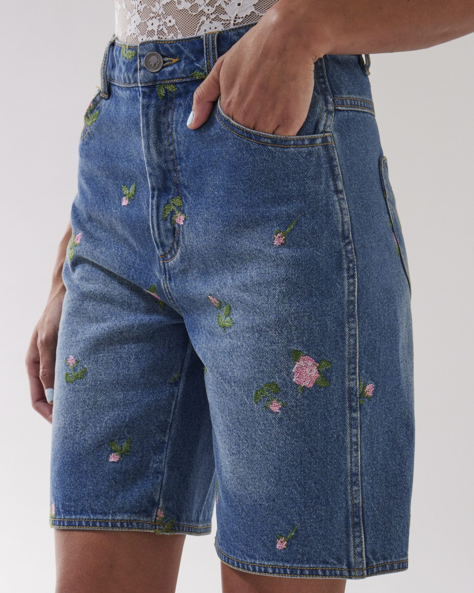 Light blue denim shorts detailed with CROSS STITCH ROSEBUDS embroidery and finished with heart-shaped back pockets. Create a distinctive layered look by pairing them with the ESSENTIAL BOW LACE BODYSUIT and completing the set with the ROSA CROSS STITCH JEANS JACKET.