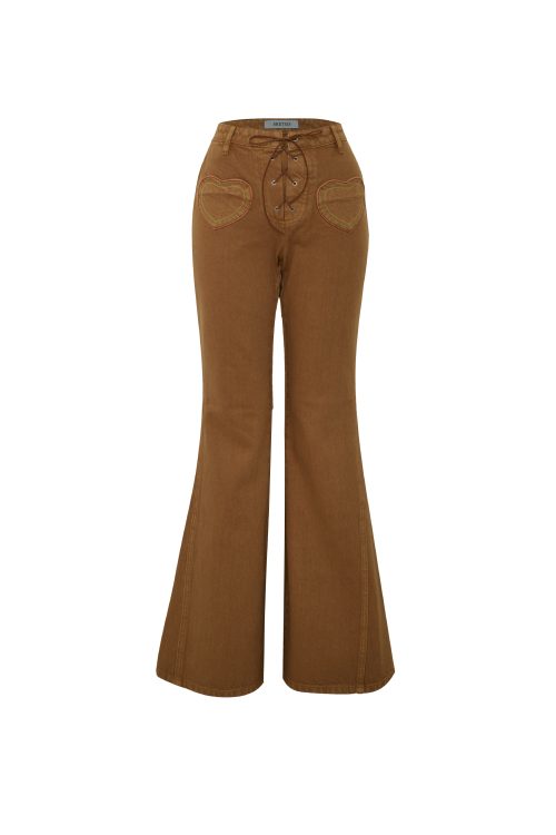 These brown denim bootcut jeans are an essential piece in the collection, offering versatile styling options from pairing with a classic tee to a favorite blouse. Finished with an adjustable waist tie detail that adds both function and definition.