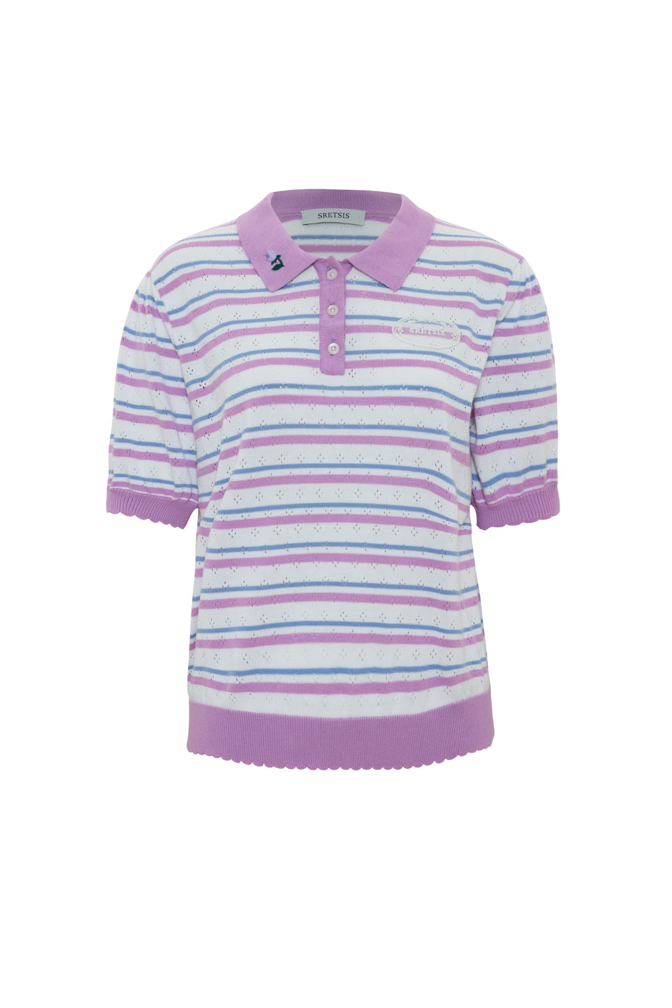 A short-sleeve striped knit polo shirt, detailed with petite rose embroidery at the collar and finished with the signature DAISY GARDEN logo patch. A refined essential that balances tailored polish with everyday versatility.