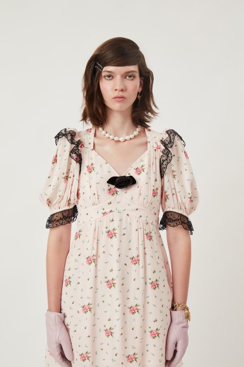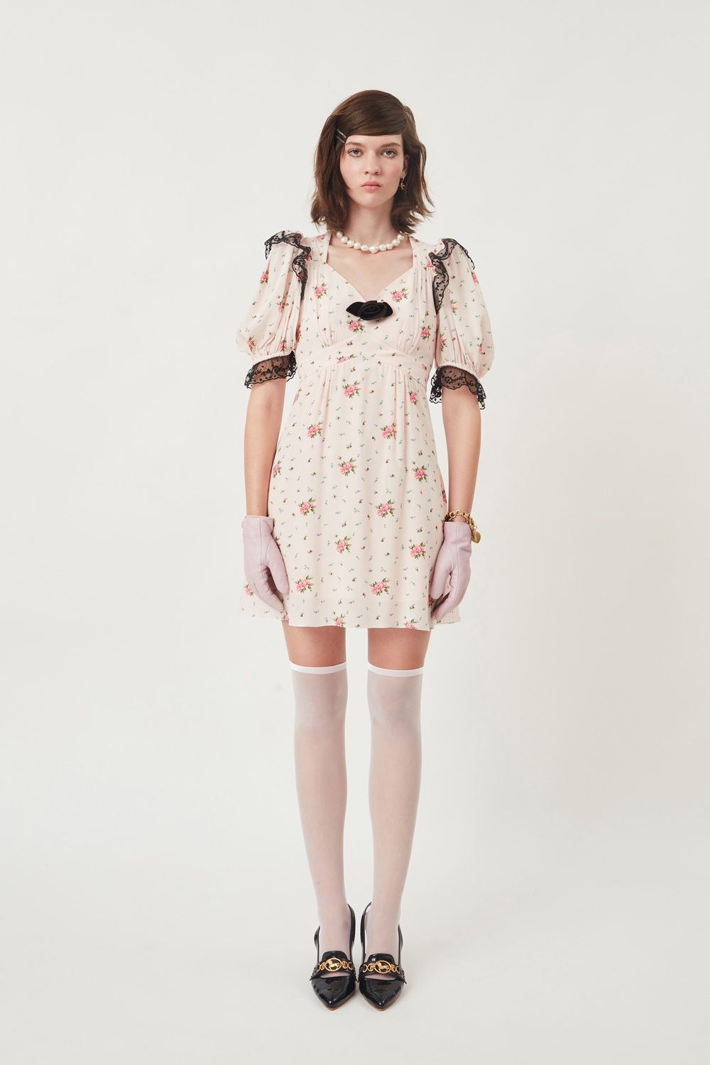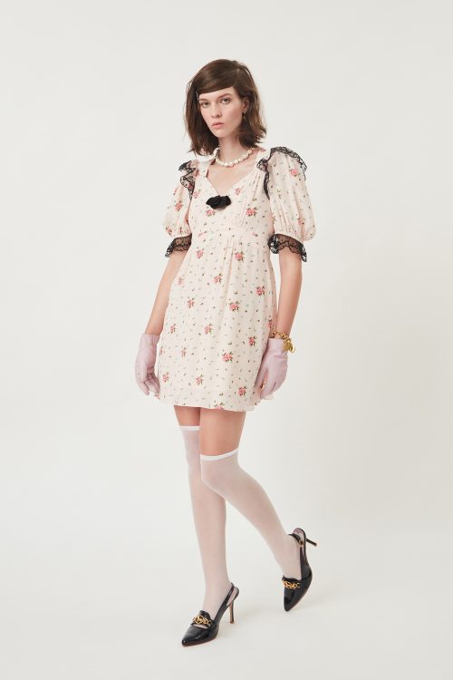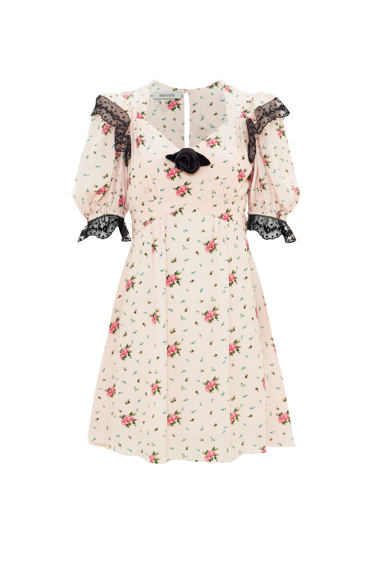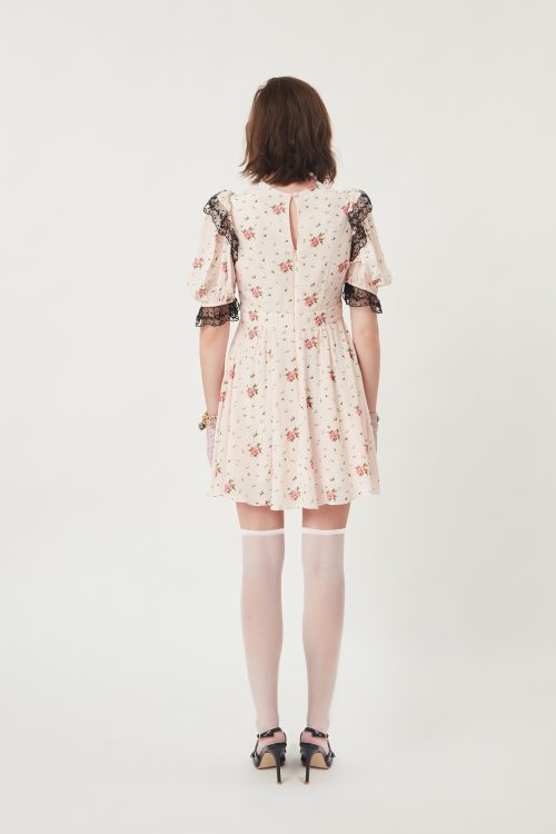 GRANDMA'S BOY Pink Mini Dress in Rayon-Viscose Blend, accented with black lace detailing on the shoulders and sleeve hems. A rose brooch on the chest adds a unique charm. Style it with tights and your favorite flat shoes to complete a captivating look.