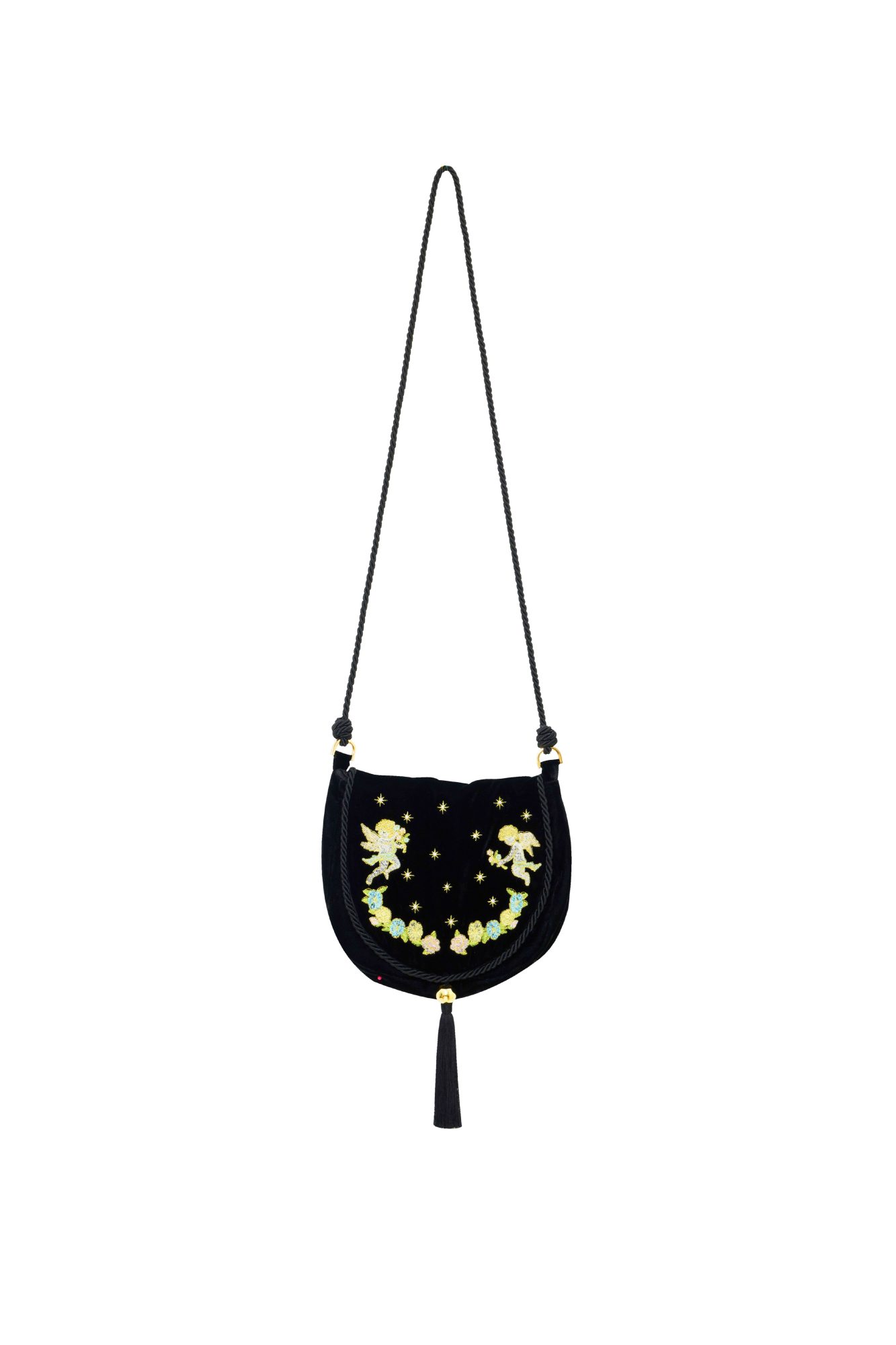 A black velvet crossbody bag adorned with intricate Lover’s Vines embroidery, featuring a cupid nestled among floral vines. An elegant companion for a variety of occasions.