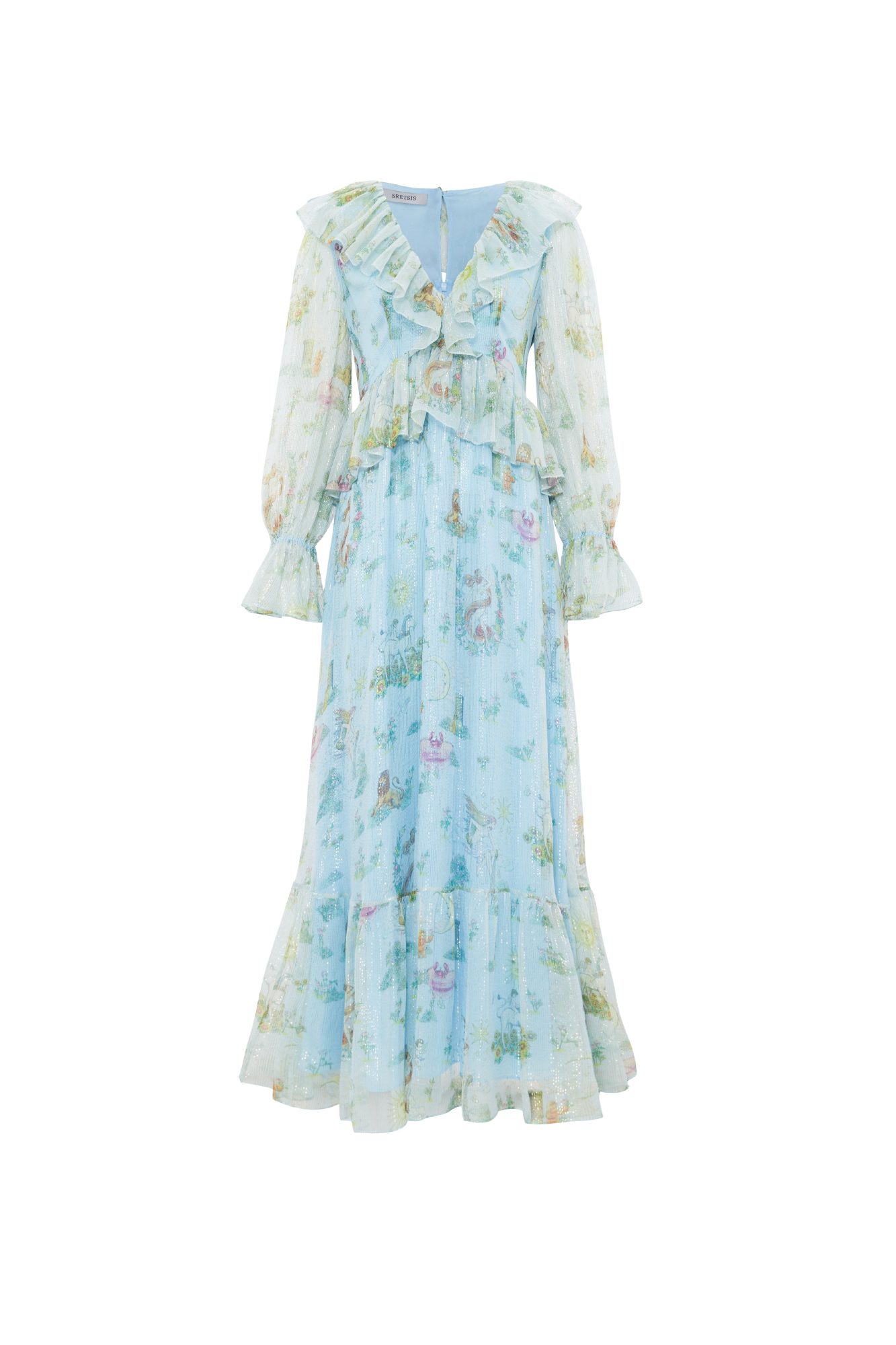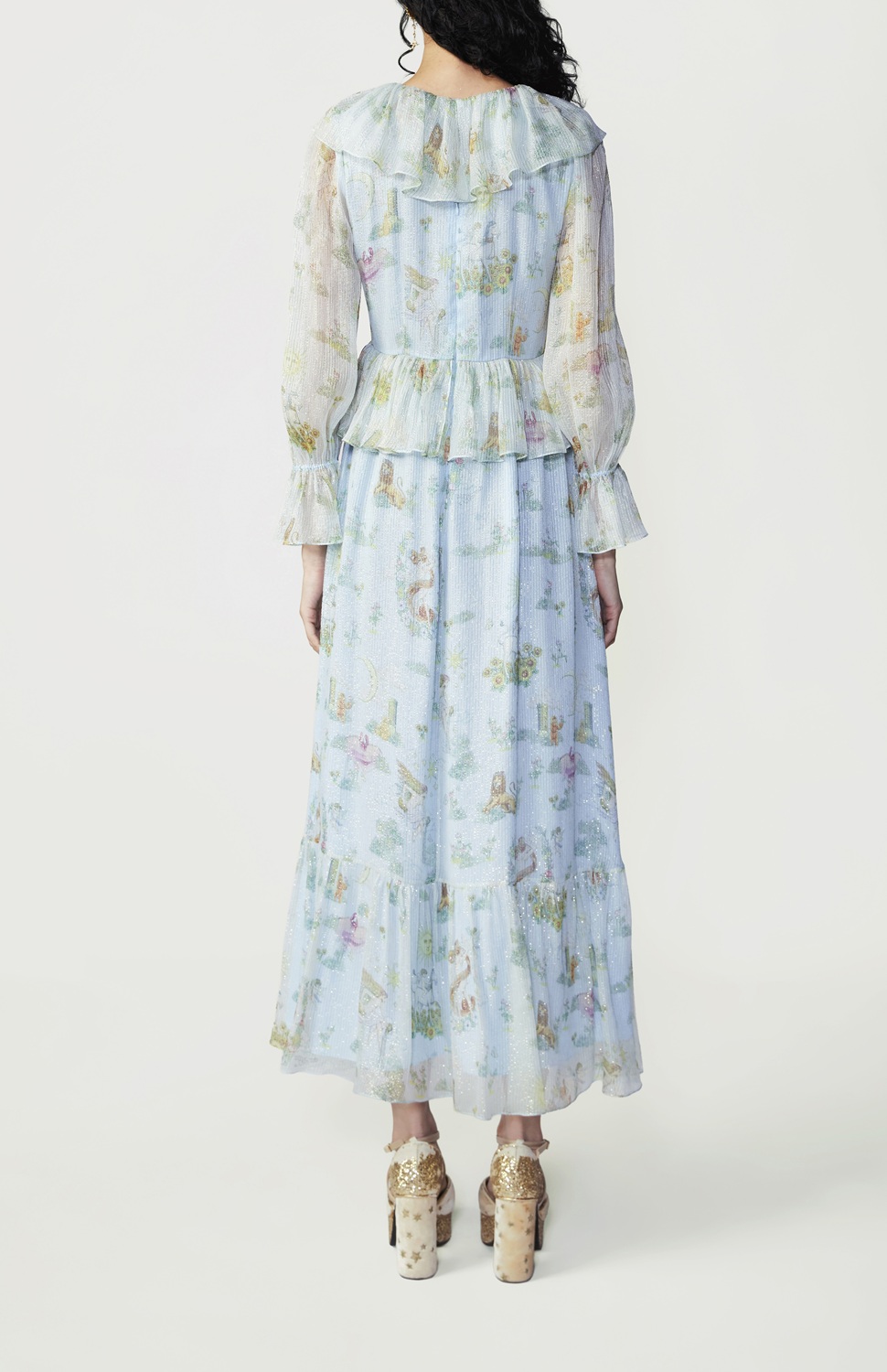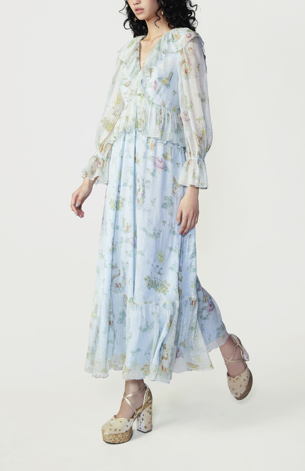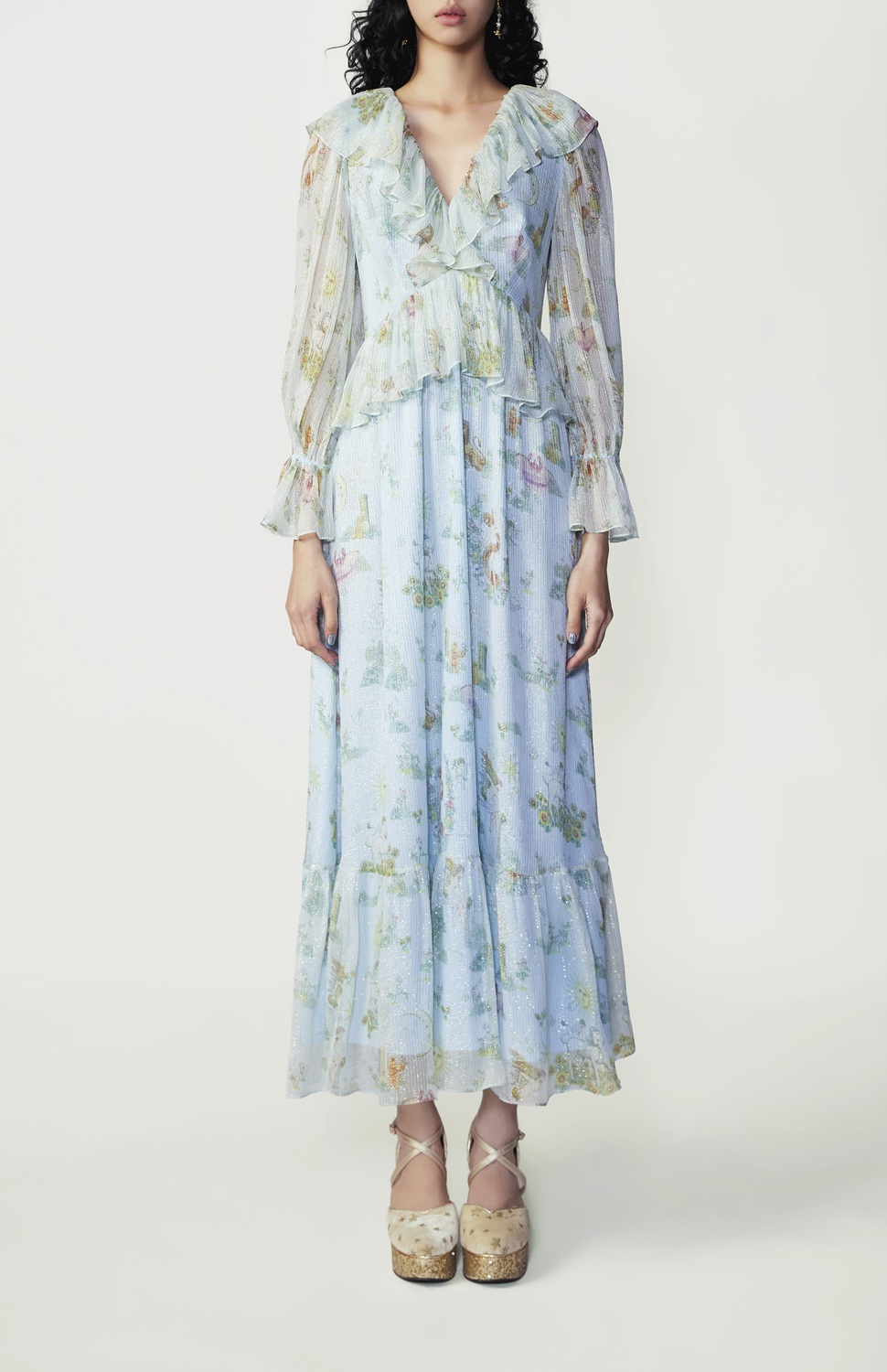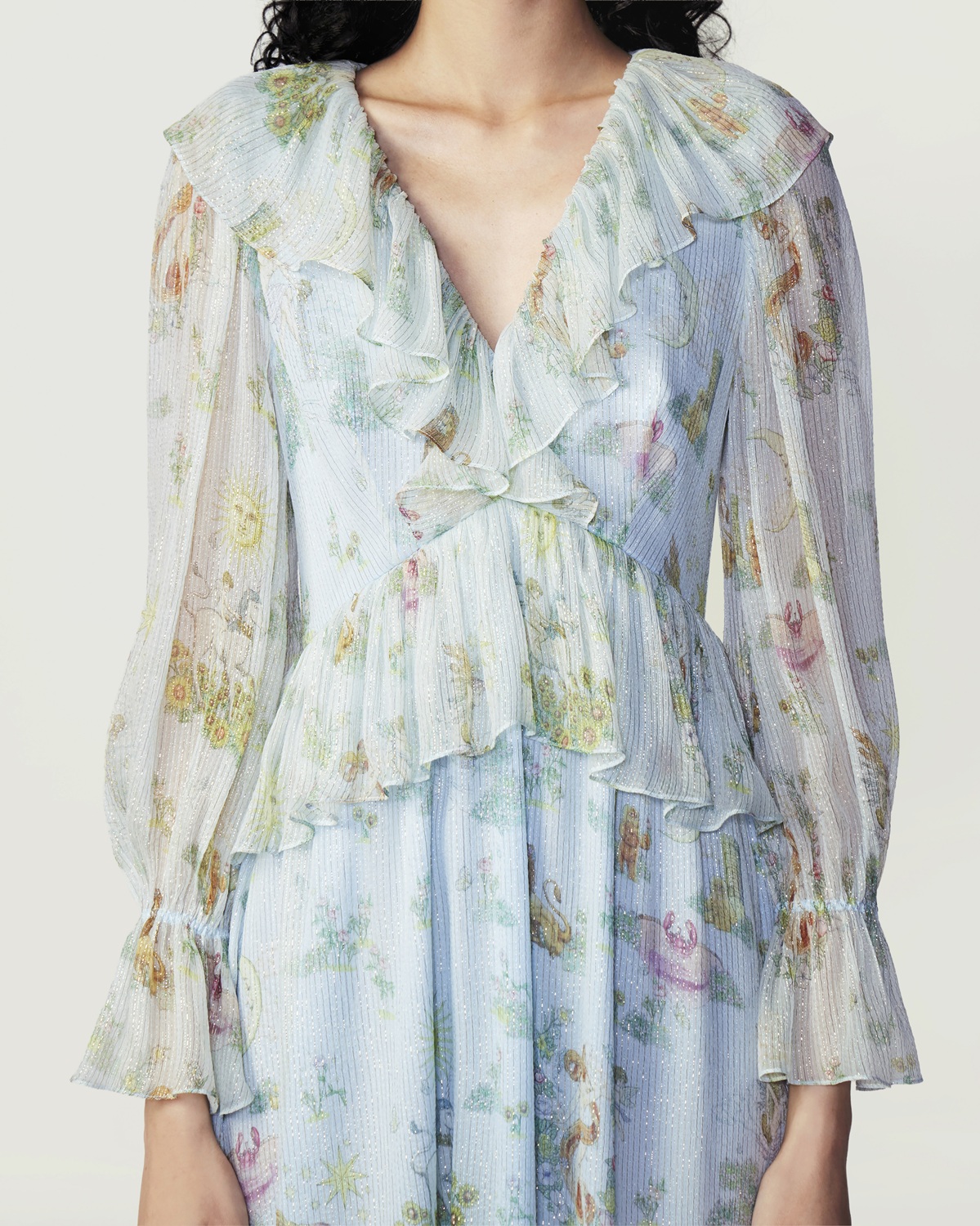 A statement maxi dress in light blue lurex, subtly woven with gold sequins in the SYZYGY STARDUST print. Designed with a ruffled V-neck collar, it exudes depth and allure for standout moments. Pair with shimmering accessories to amplify your presence with graceful impact.