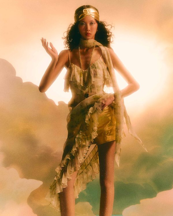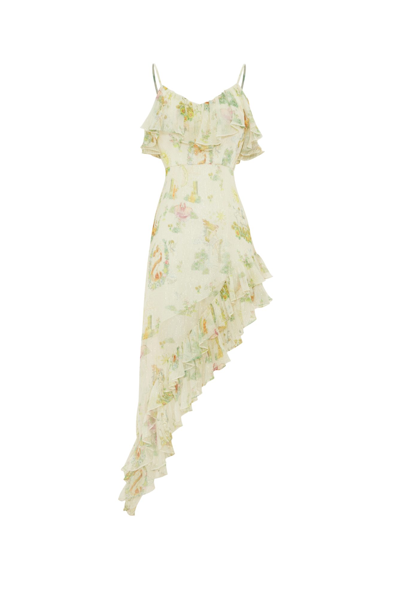 A long silk-lurex slip dress featuring the signature SYZYGY STARDUST print. Designed with an asymmetrical ruffled hem for graceful movement and a shimmering finish, this piece captures the perfect balance of elegance and allure, ideal for any special occasion that calls for a touch of brilliance.