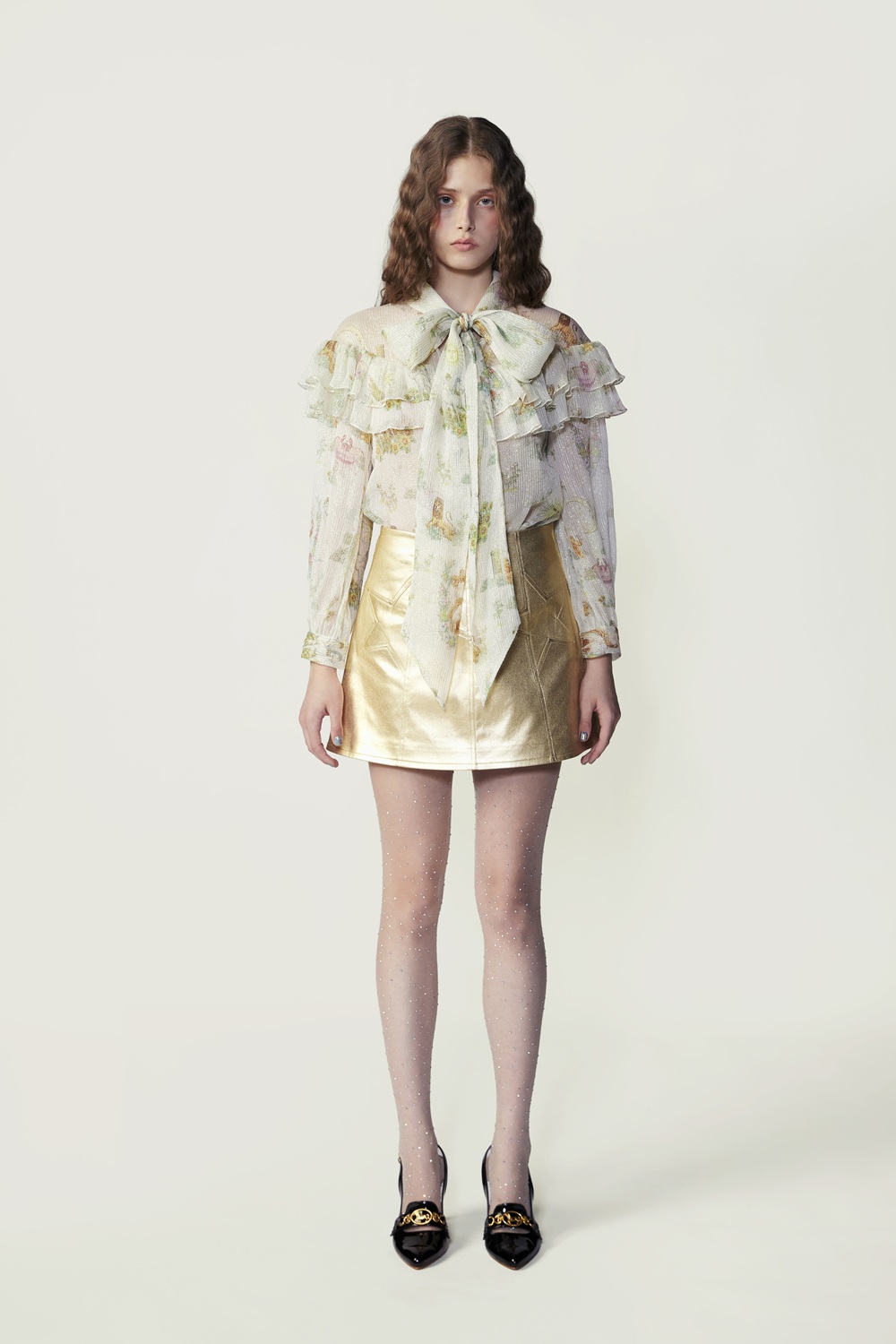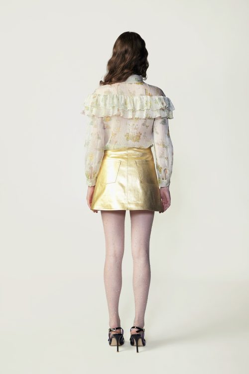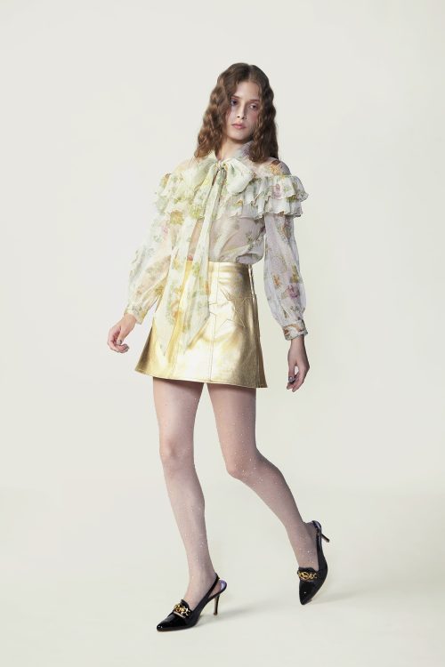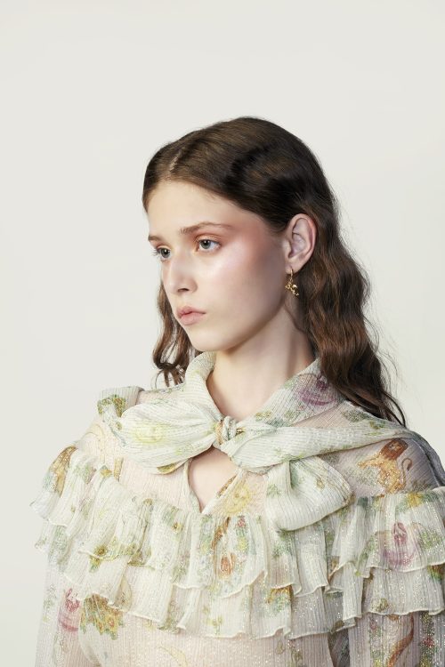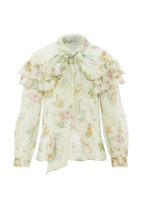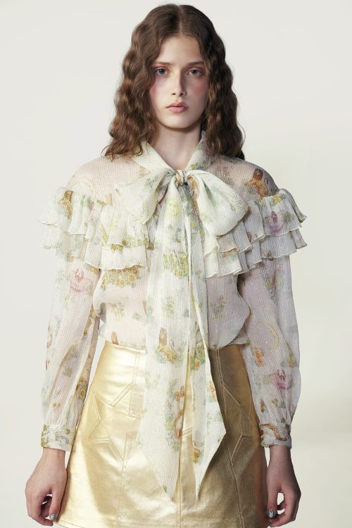 Crafted from lustrous silk-lurex, this long-sleeved blouse showcases the season’s signature Syzygy Stardust print. A dramatic necktie bow and soft shoulder ruffle collar. Style it with the Stardust Mini Skirt for a coordinated ensemble that radiates confidence and light.