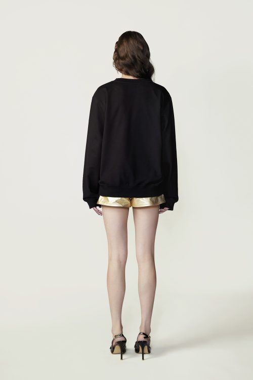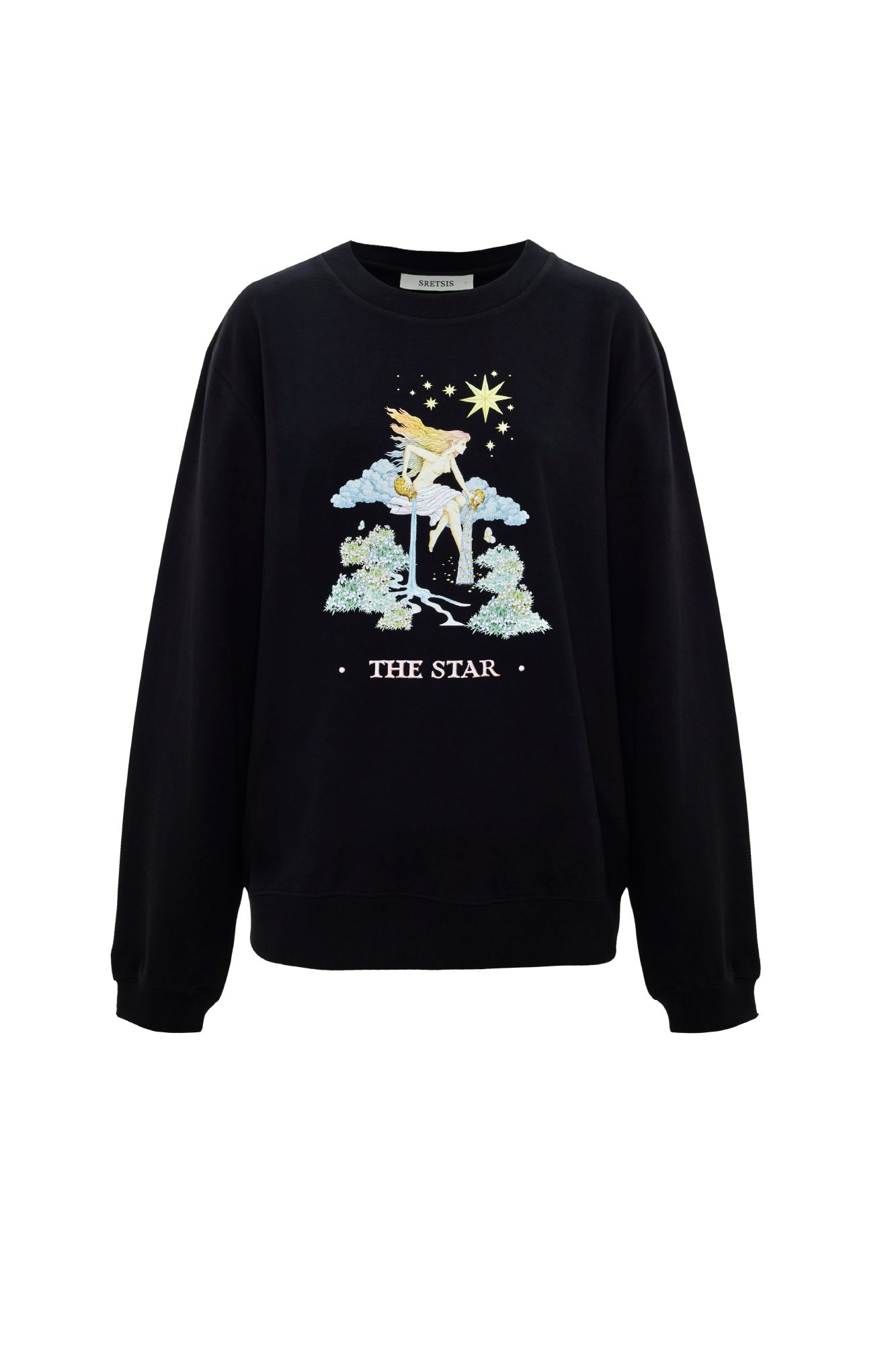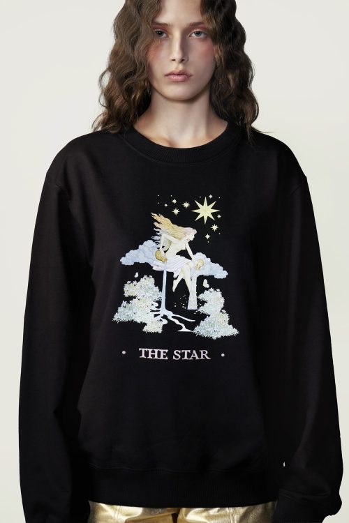 Crafted from black French terry, this long-sleeved jumper features an exclusive The Star tarot-inspired artwork. A versatile essential with a cosmic edge, perfect for the approaching winter break. Style it with the metallic Ziggy Hot Pants for a confident, statement-making silhouette.