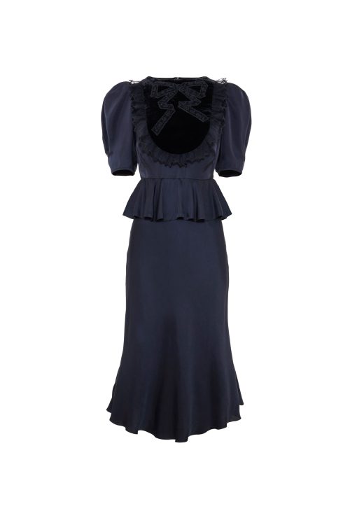 This black velvet fitted dress captures a sense of understated sophistication, featuring an elegant lace bow detail at the bust and delicate ruffle accents that enhance its refined femininity. Perfect for evening occasion