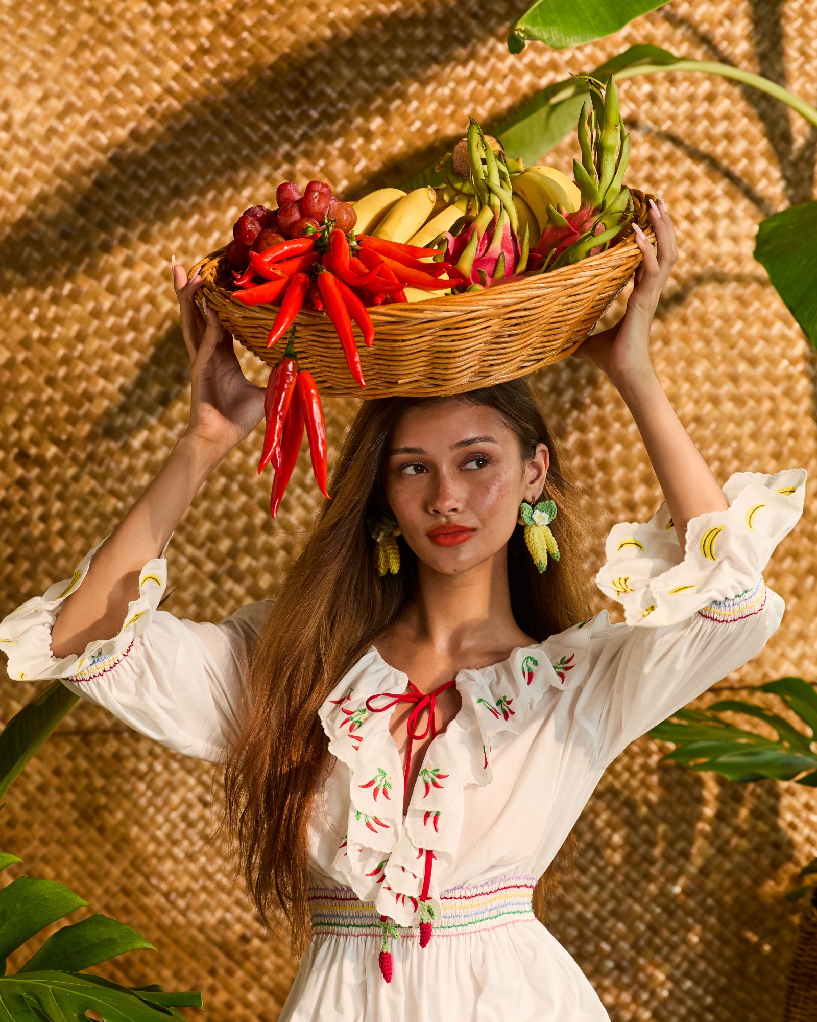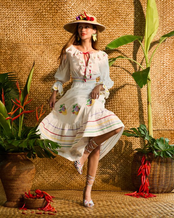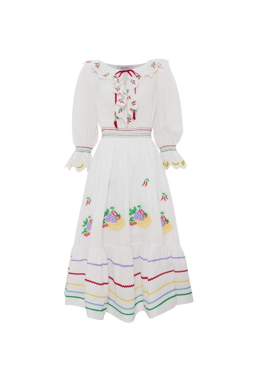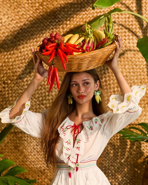 A white cotton-voile casual dress featuring charming Mixed Fruit embroidery—banana detailing along the ruffled collar and chilli motifs at the sleeve hems. The red front-tie bow adds a playful accent, creating an effortless everyday look that’s easy to style and comfortable to wear.