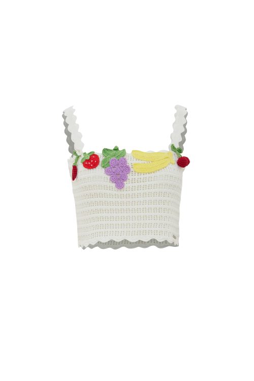 This knitted camisole features Mixed Fruit embroidery and playful crochet chilli ties at the shoulders, bringing a lively touch to an everyday casual look. Easy to mix and match, it pairs perfectly with the HOT CHILLI SHORTS and FRUTTI CROCHET HEAD SCARF for a coordinated outfit.