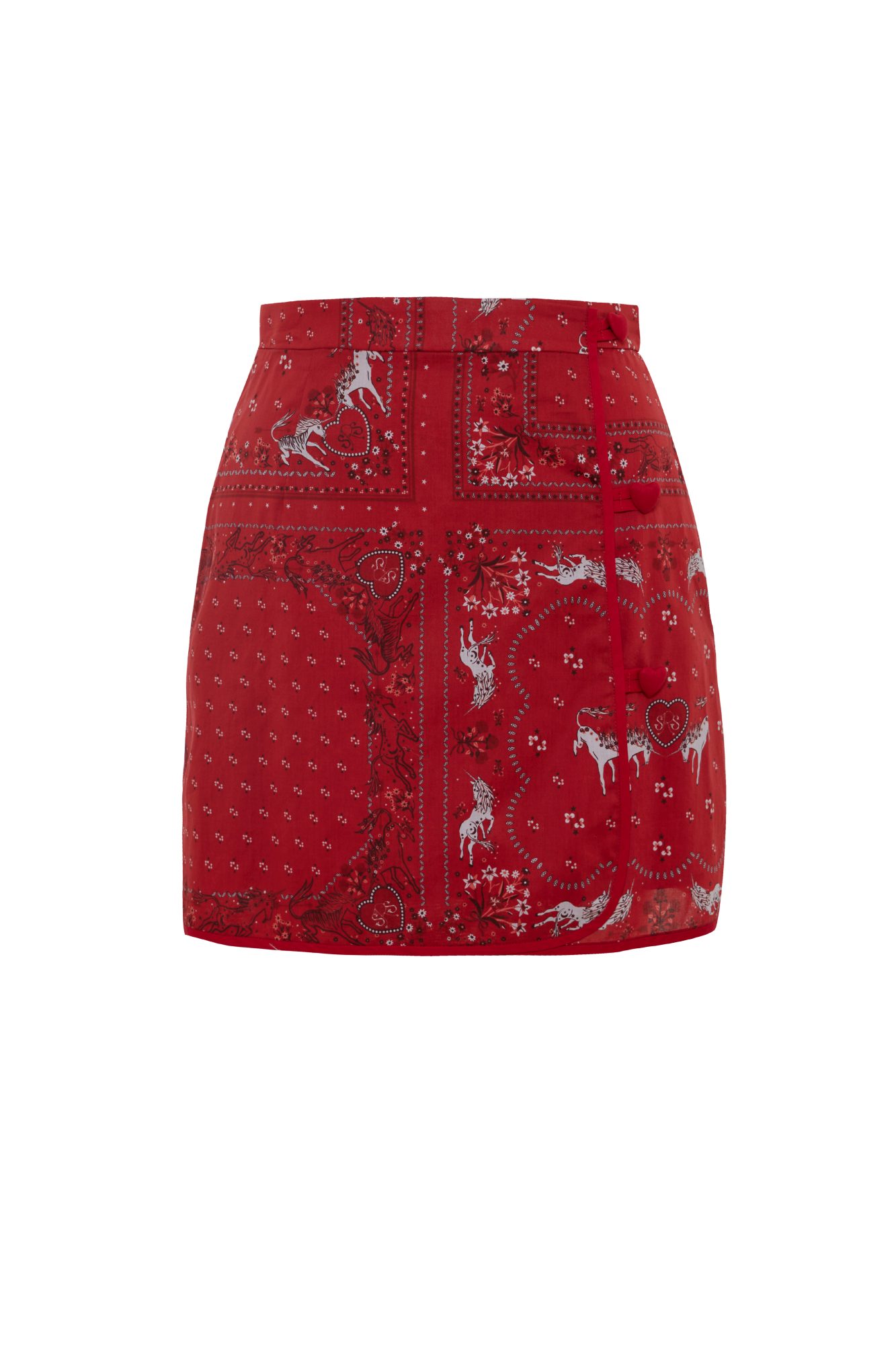 A cotton mini skirt featuring the Unicorn Bandana print, finished with small heart-shaped buttons along the front. Designed with the Lunar New Year spirit in mind, this piece offers versatile styling for both casual and special moments. Pair it with the UNICORN LUNA BLOUSE for a coordinated set.